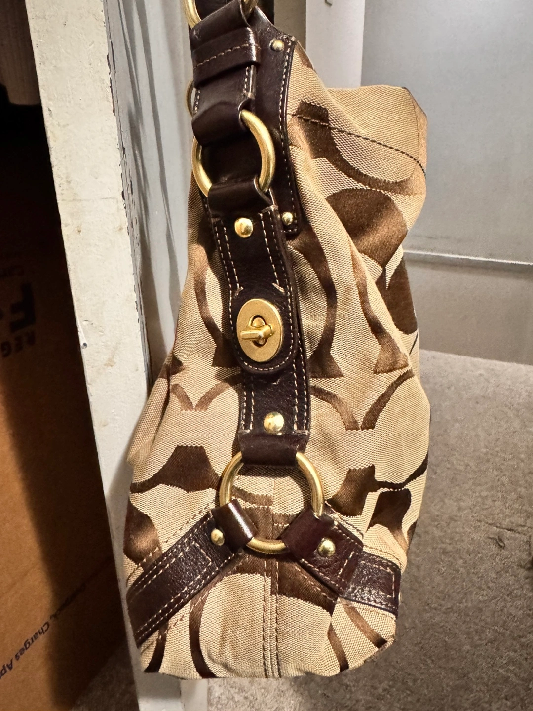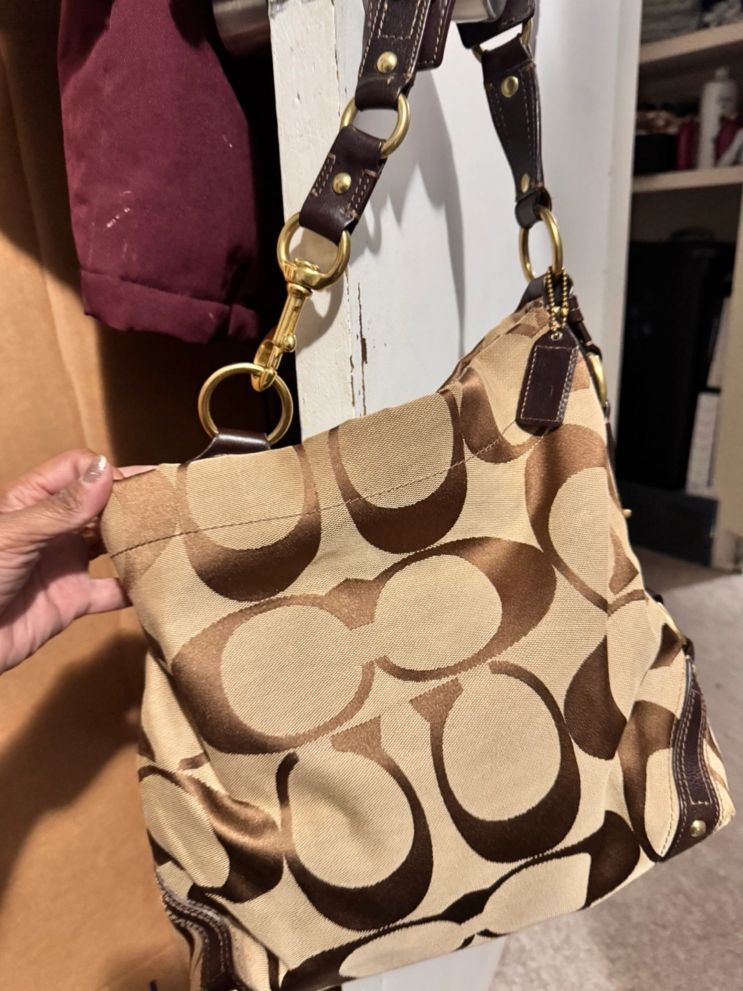 Selling a stylish Coach hobo bag in a lovely brown and beige colour. It's in great condition and perfect for everyday use! The bag features the classic Coach pattern and has a comfortable shoulder strap. The interior is spacious and has a zipper.