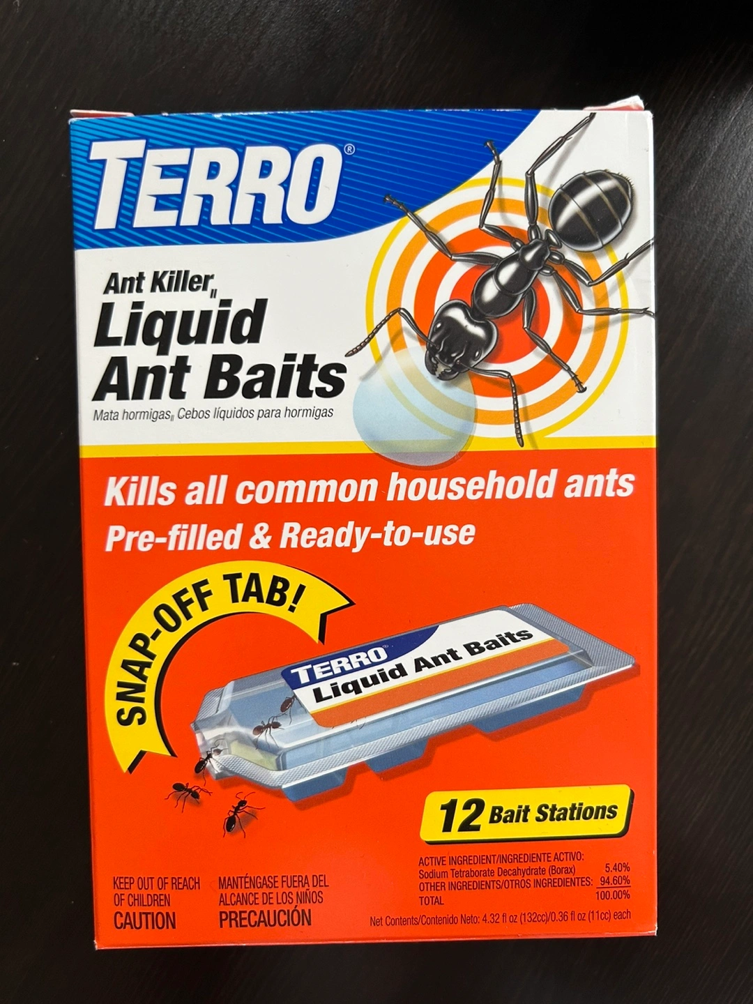 Selling a box of TERRO Liquid Ant Baits. It comes with 12 pre-filled and ready-to-use bait stations. These kill all common household ants. The active ingredient is Sodium Tetraborate Decahydrate (Borax). Net contents: 4.32 fl oz (132cc)/0.36 fl oz (11cc) each