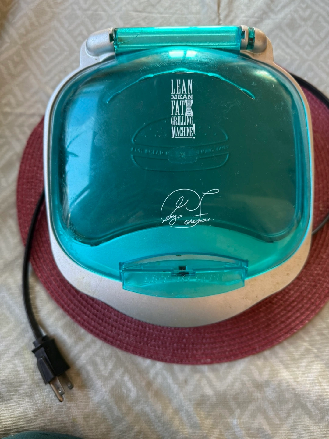 Classic George Foreman grill – perfect for quick, healthy meals. Compact size ideal for small kitchens or dorms. Heats up fast and grills evenly. Non-stick grill plates make cleanup a breeze. Lid doubles as a bun warmer. Works well, in good condition with minor signs of use.