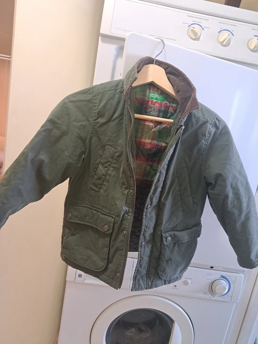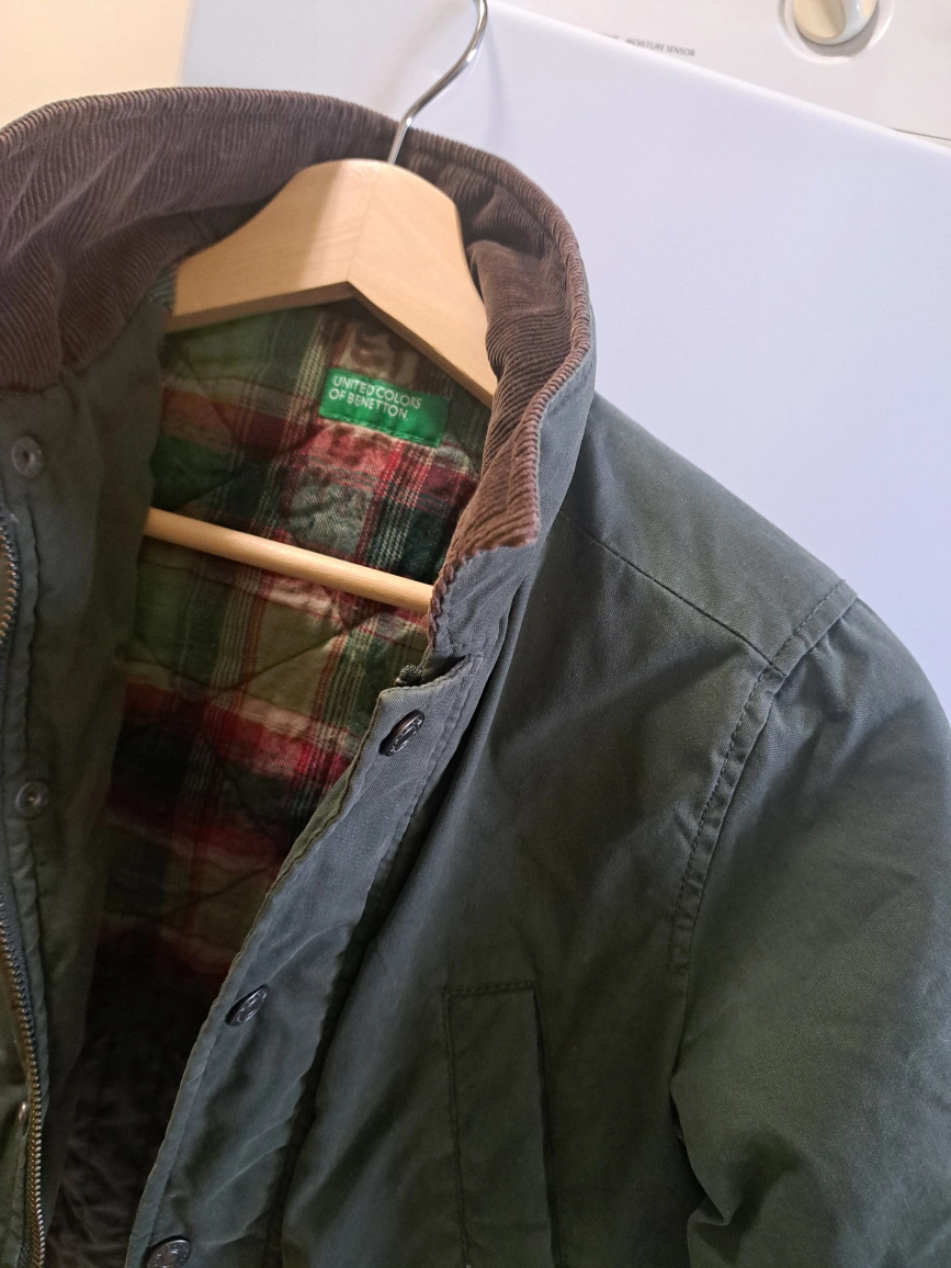 82Here's a stylish jacket from United Colors of Benetton! It's a nice olive green colour with a corduroy collar and a red and green plaid lining. Perfect for those cooler days!