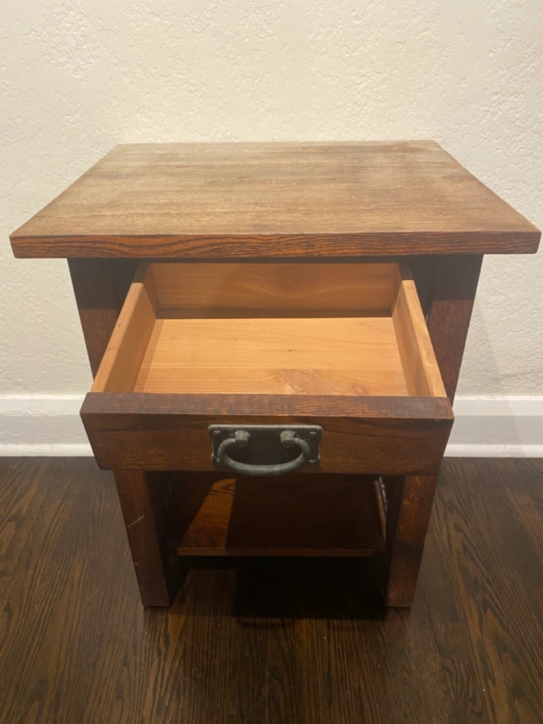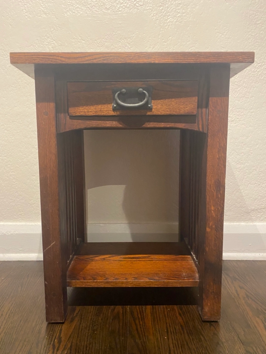 Here's a charming wooden side table, perfect for adding a touch of rustic elegance to any room! It features a handy drawer and a lower shelf for extra storage or display. It's in good condition and ready to find a new home!