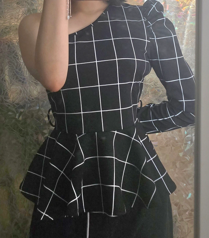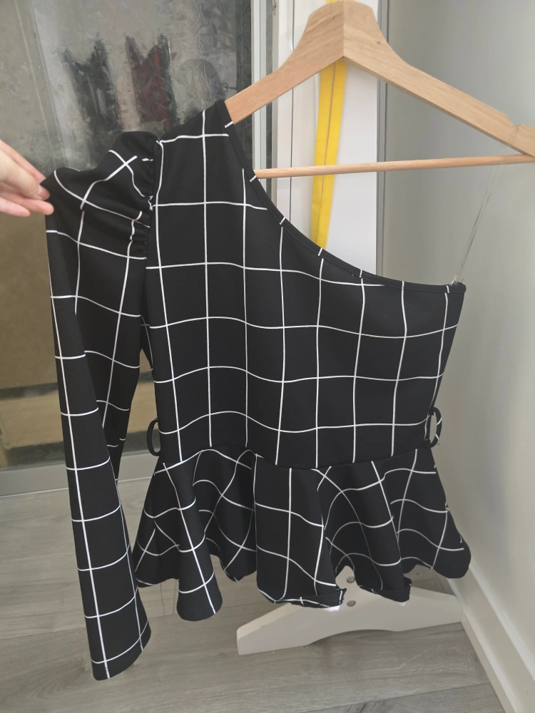 Selling a cute Seduction top with a black and white grid pattern! It features a one-shoulder design with one long sleeve, and a peplum style bottom. It has belt loops to belt if you want to. Only worn once