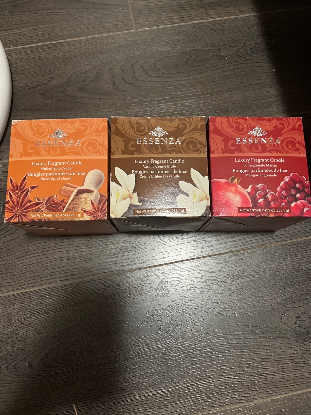 Selling a set of three Essenza luxury fragrant candles. The set includes Mulled Spice Sugar, Vanilla Crème Brule, and Pomegranate Mango scents. Each candle has a net weight of 9 oz (255.1 g)