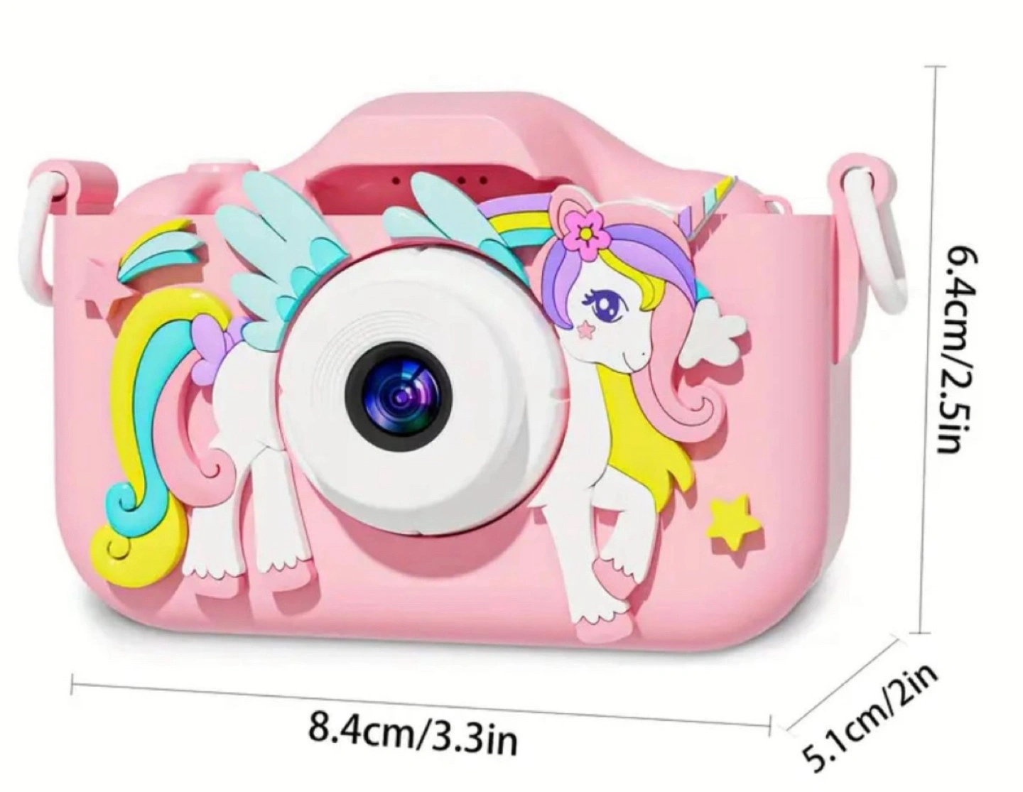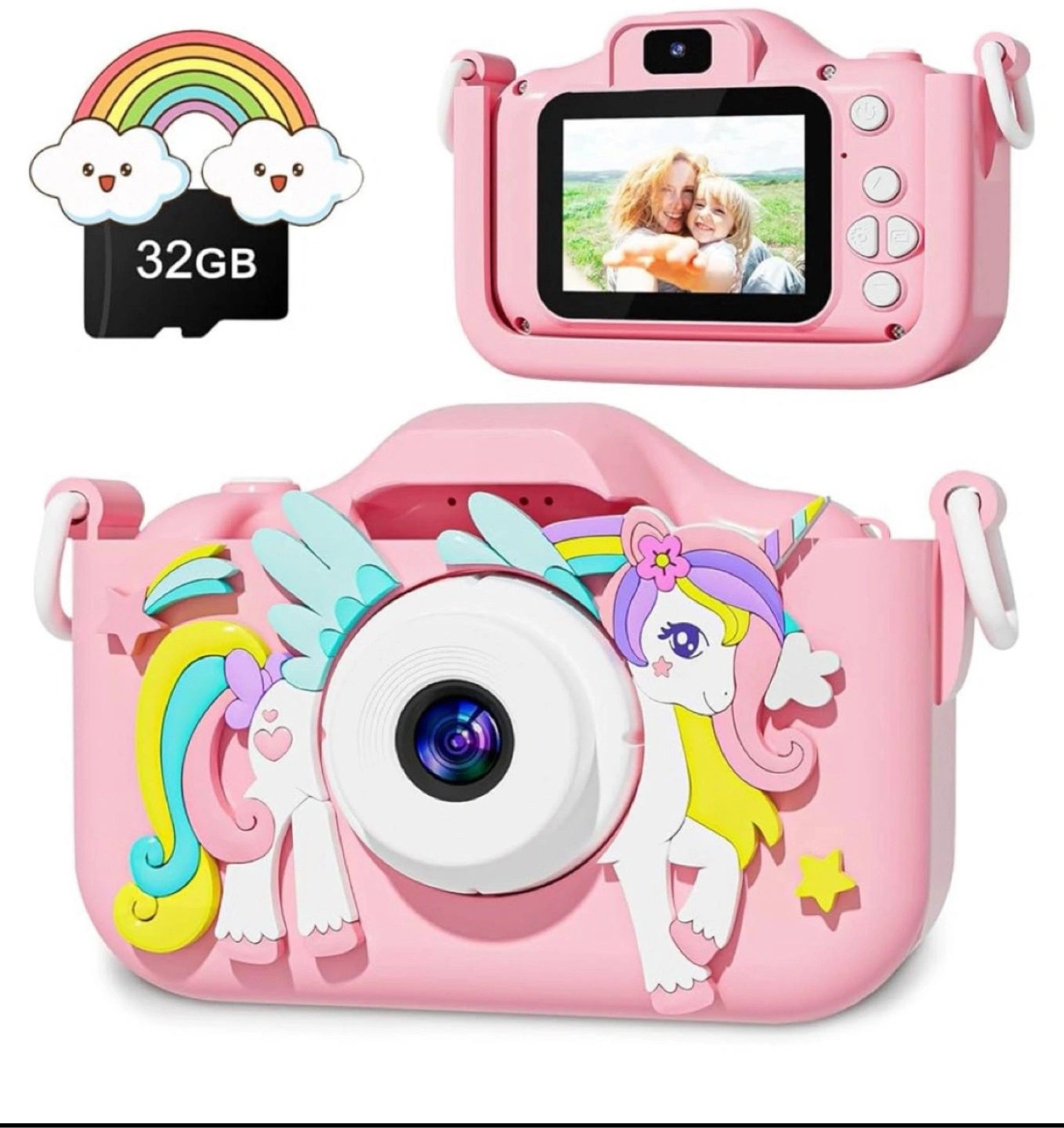 Selling a brand-new, unopened kids’ digital camera in pink, featuring a cute unicorn design. Perfect for children who love photography and creativity! What’s Included? ✅ Kids’ digital camera with a protective silicone unicorn case ✅ 32GB memory card (included) ✅ USB card reader ✅ Charging cable ✅ Neck strap ✅ User manual Product Features: Fun & easy-to-use camera for kids Takes photos & records videos 32GB storage included – plenty of space for photos & videos Rechargeable battery – long-lasting for extended playtime Cute unicorn design – soft silicone case for extra durability Size: 8.4cm x 6.4cm x 5.1cm