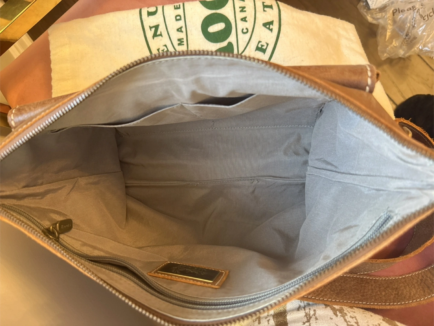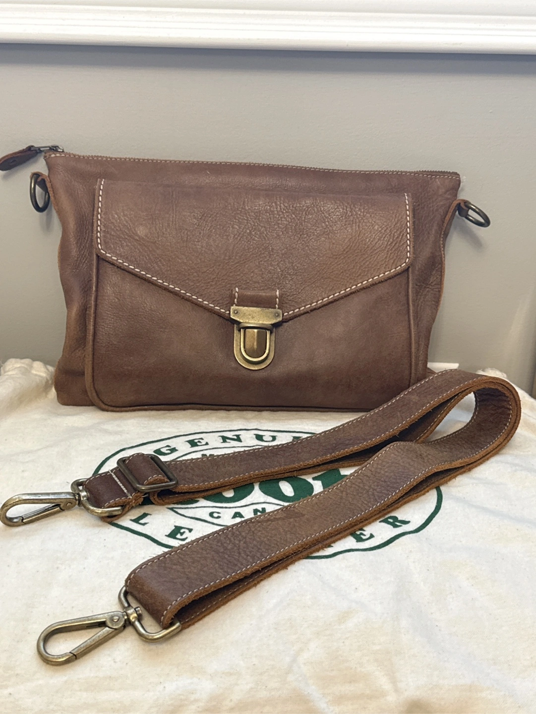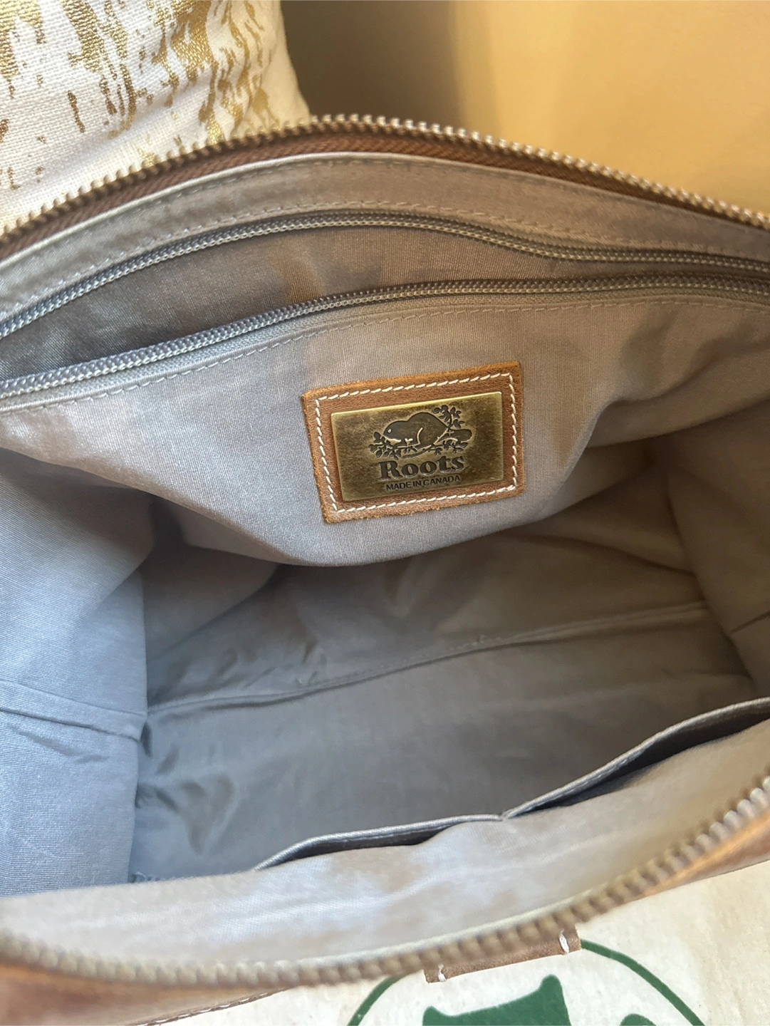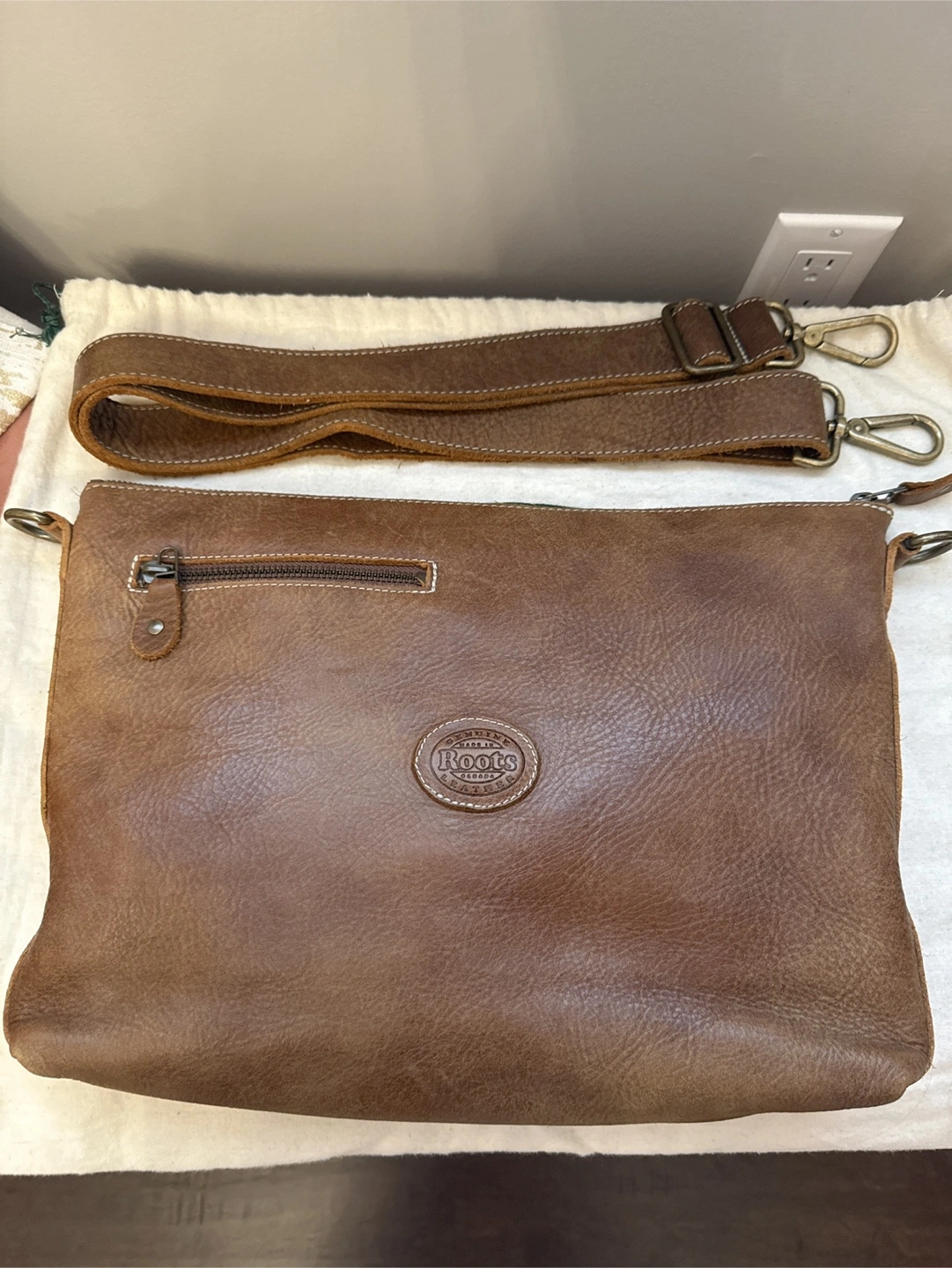 125This is a Roots leather satchel bag never used! It features a detachable strap and a front pocket [ that fits agenda or mini iPad] The main zip middle pockets fits a laptop . Measurements: 14inches [L] x 11 [H] x 3 [W] The bag is made of genuine leather and has a classic, timeless design. Many pockets and zip pockets to keep organization. Fabric lined. Highway quality vintage hardware . Camel color I live in Markham and ONLY can meet you at these locations in Markham area: Petro Canada Gas station: corner of 16 ave and 9th line 9259 Ninth Line Or Shoppers drug mart of Hwy7/Wooten way 6579 Highway 7 East, Markham