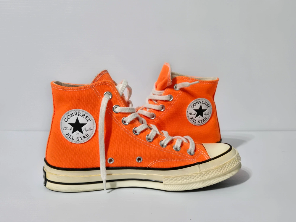 These Converse Chuck Taylor All Star 70 Hi sneakers are in great shape and ready for a new home! The vibrant orange colour really pops, and they're super comfortable for everyday wear. A classic addition to any wardrobe!