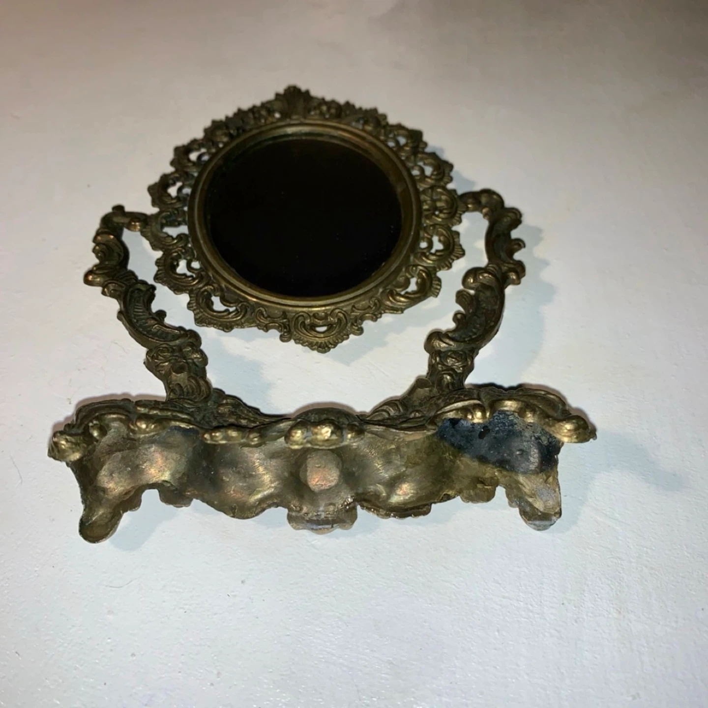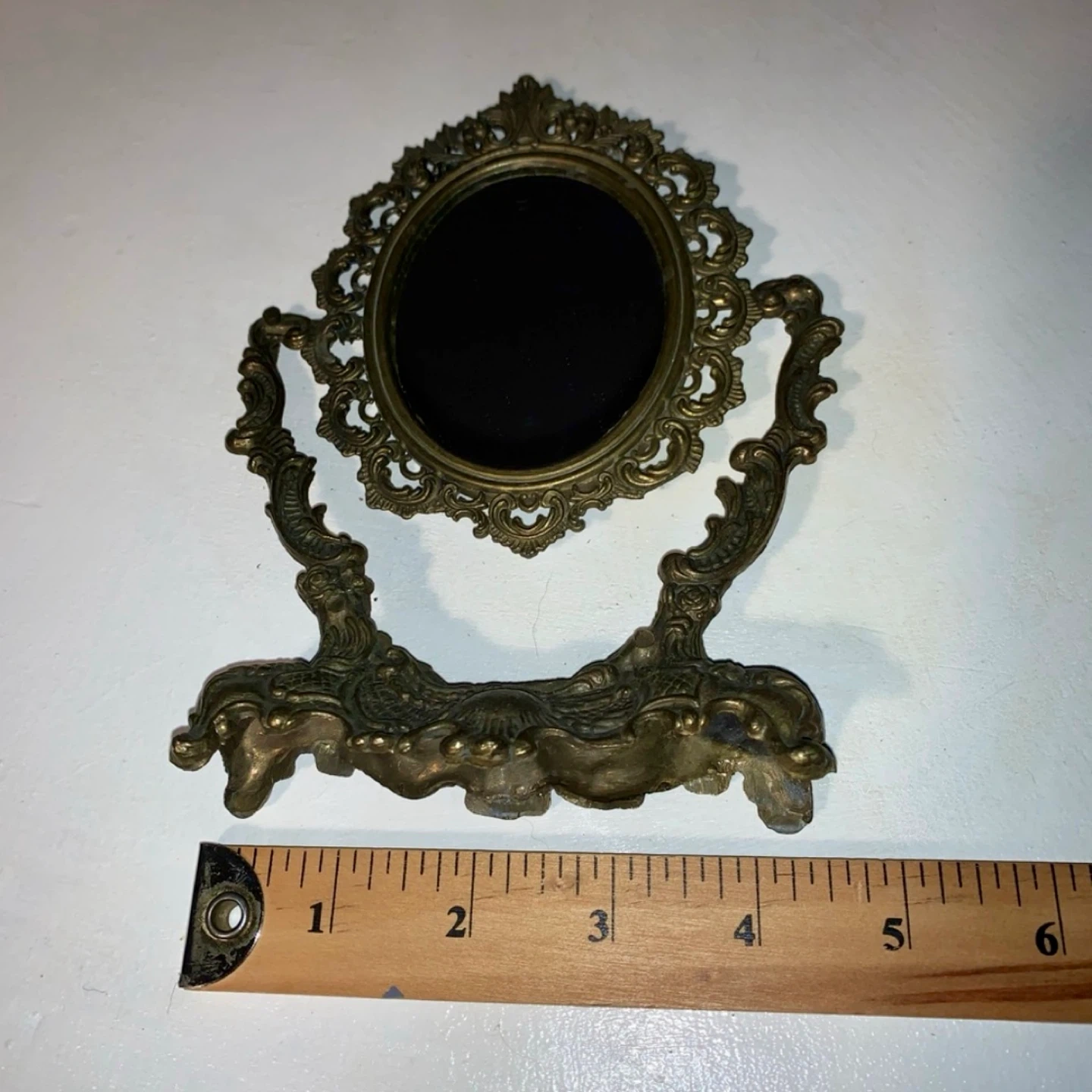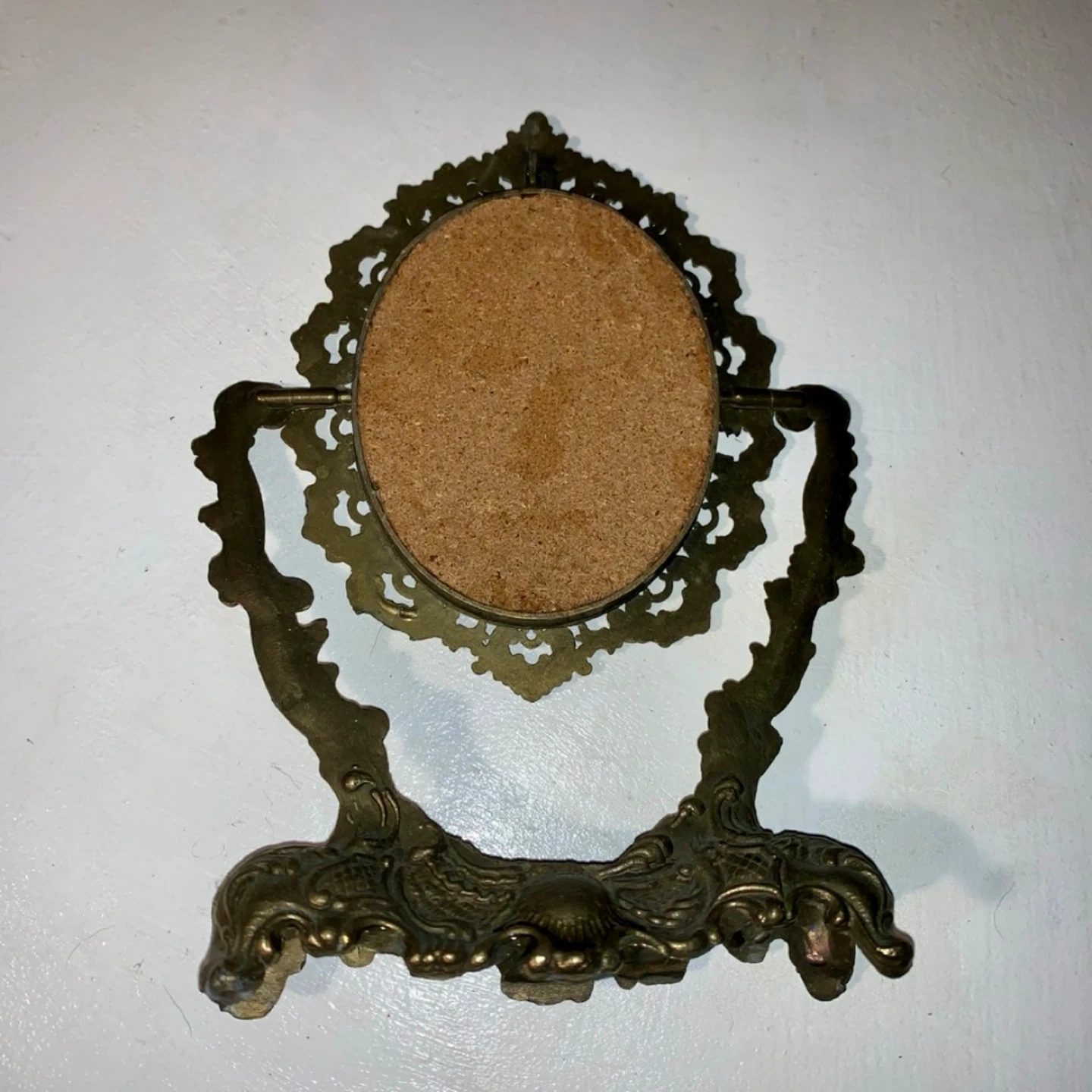 A pre-owned ornate tabletop mirror with a bronze-toned finish. The mirror features an oval shape surrounded by an intricate, scrolled frame, mounted on a decorative stand. The back of the mirror is covered with a cork material. Visible signs of age include some discoloration and some patina on the metal. View photos carefully and see measurements. The mirror itself is in excellent condition with no scratches or flaws to note. It can also make a picture frame.