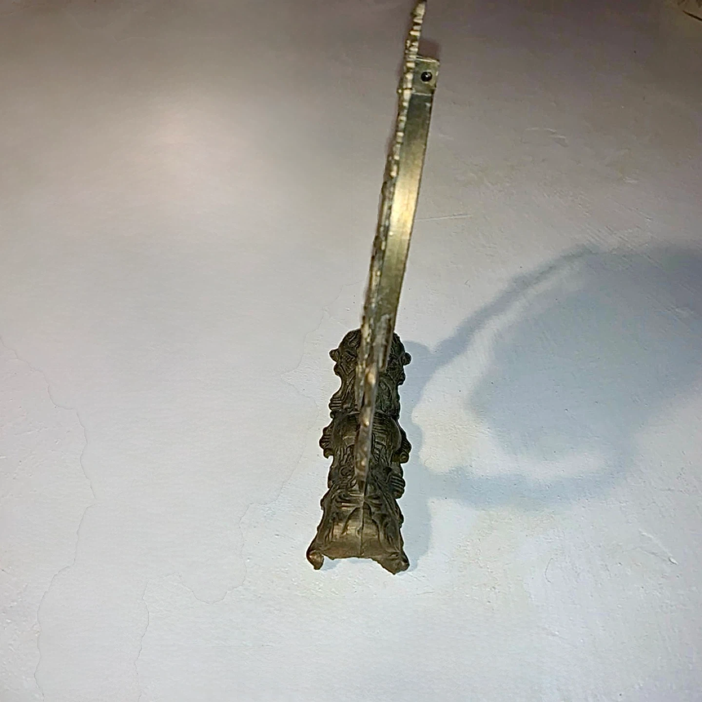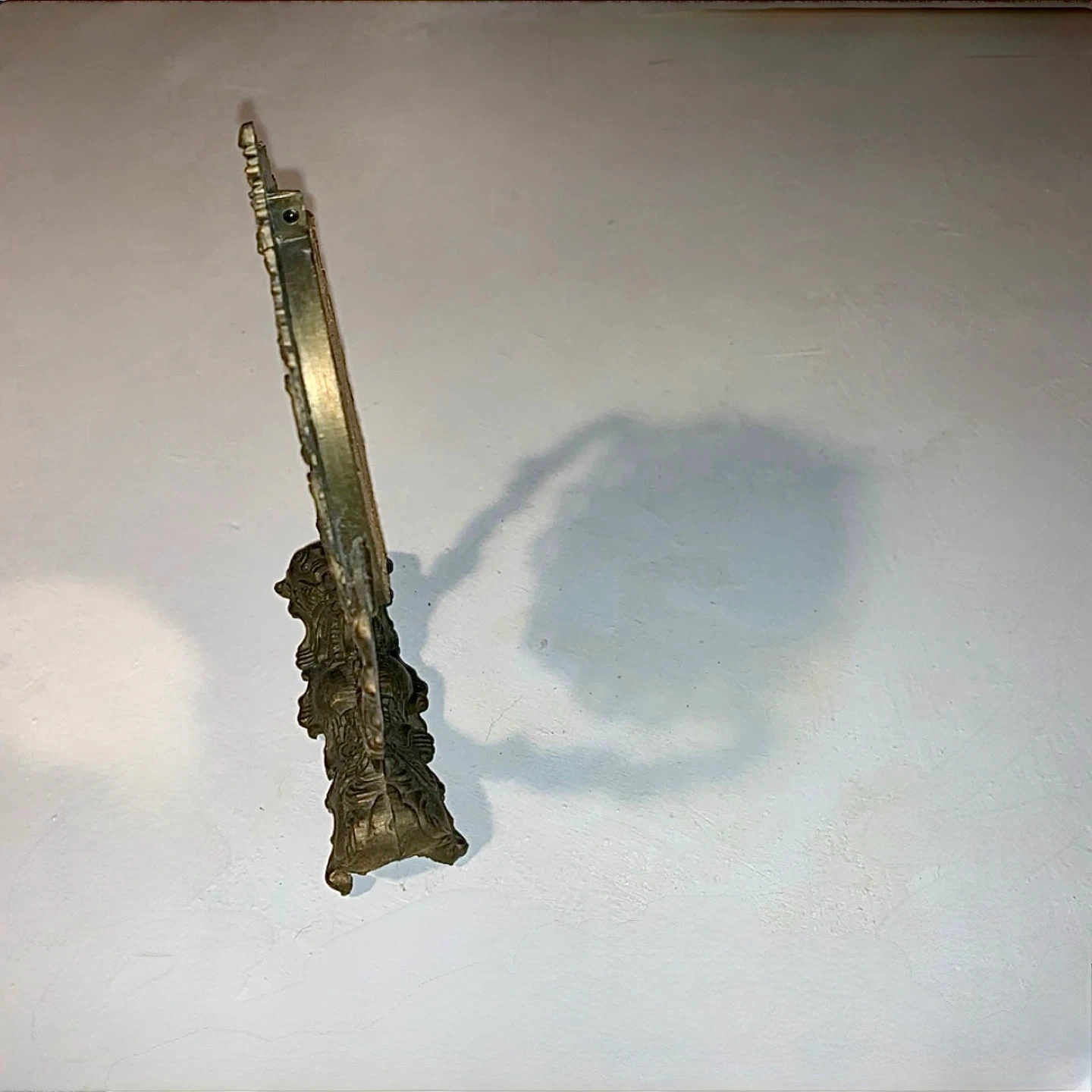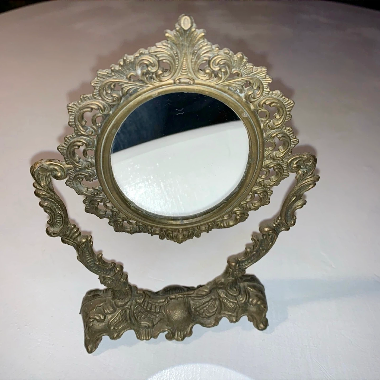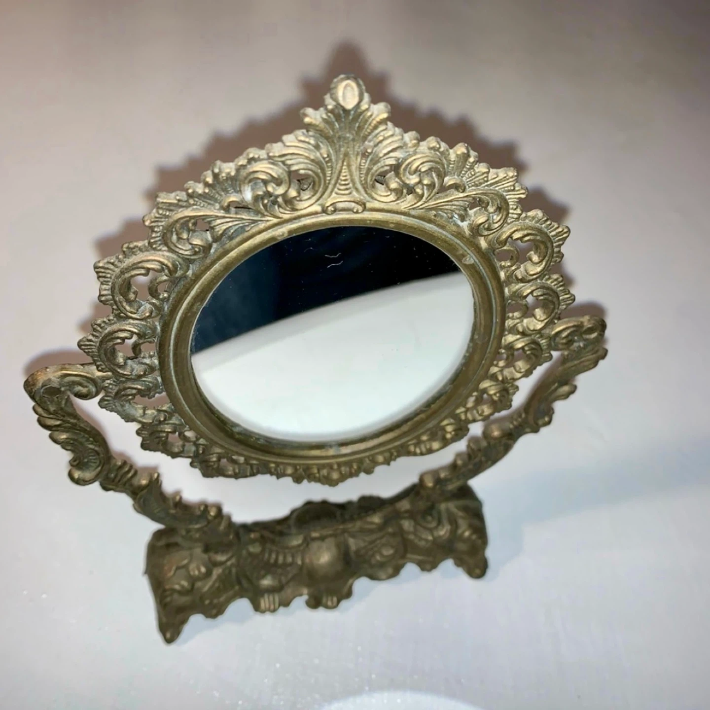 A pre-owned ornate tabletop mirror with a bronze-toned finish. The mirror features an oval shape surrounded by an intricate, scrolled frame, mounted on a decorative stand. The back of the mirror is covered with a cork material. Visible signs of age include some discoloration and some patina on the metal. View photos carefully and see measurements. The mirror itself is in excellent condition with no scratches or flaws to note. It can also make a picture frame.