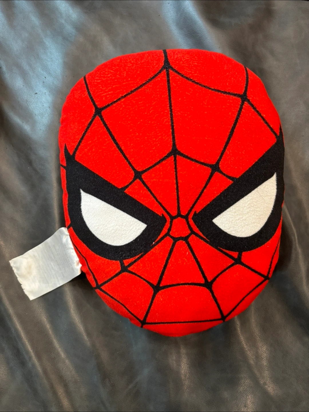 A Spiderman pillow that has Spiderman on one side and his mask on the other. It's in great condition and ready for a new home.