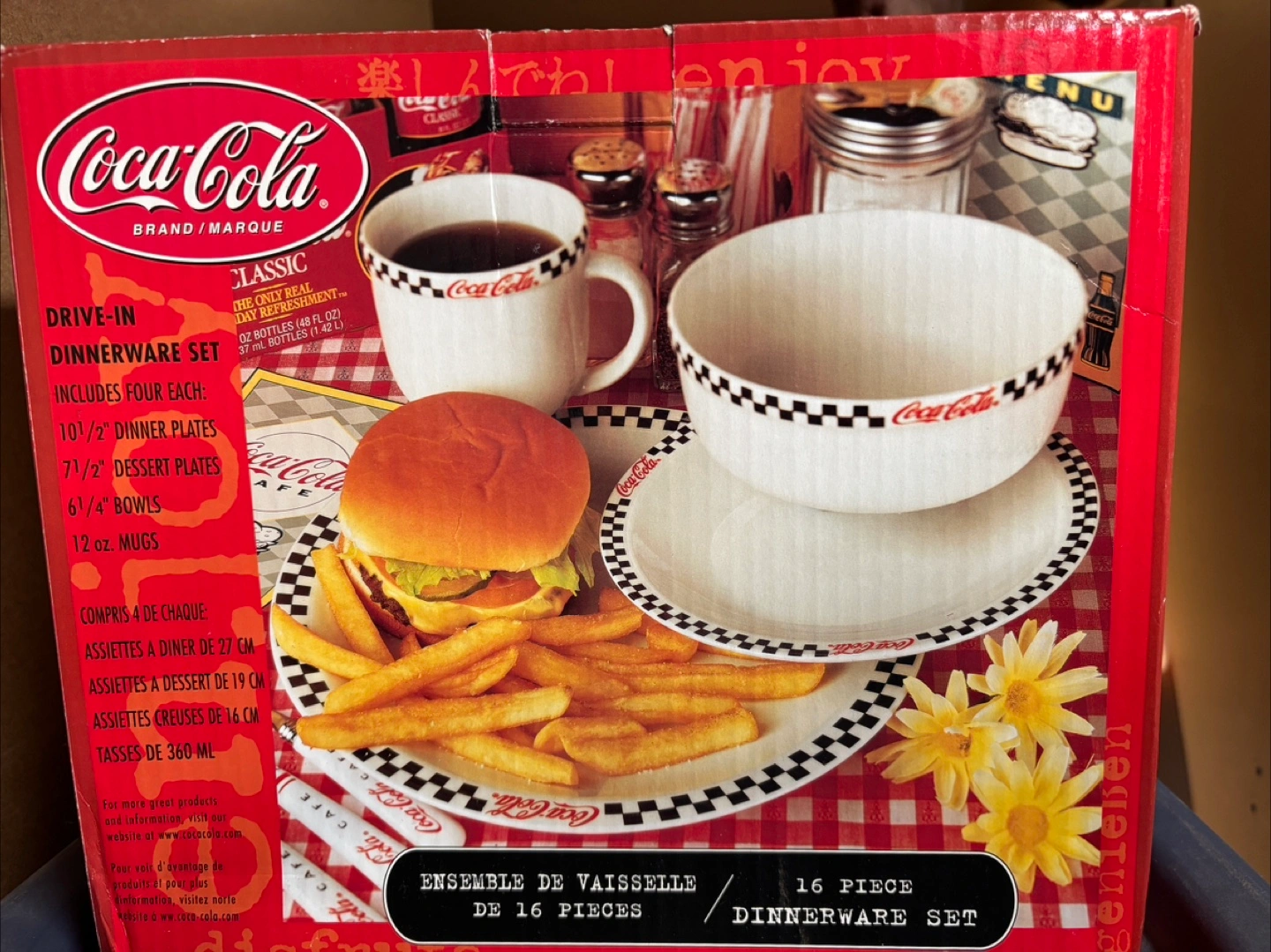 Selling a Coca-Cola 16-piece drive-in dinnerware set! This classic set includes four each of the following: