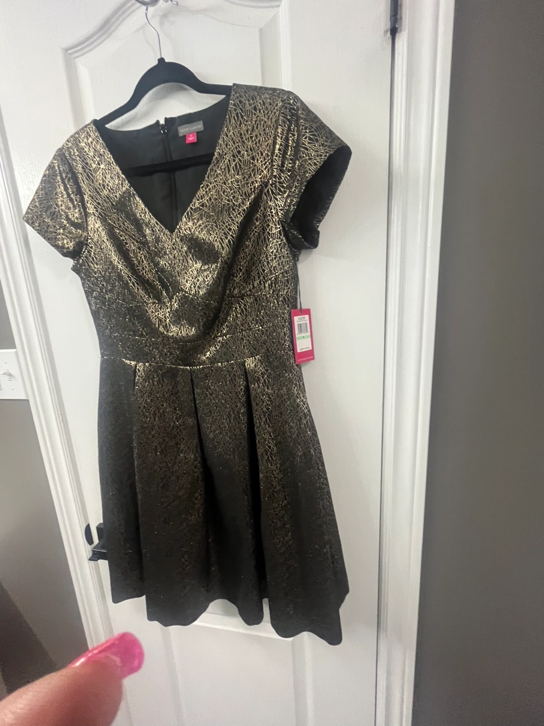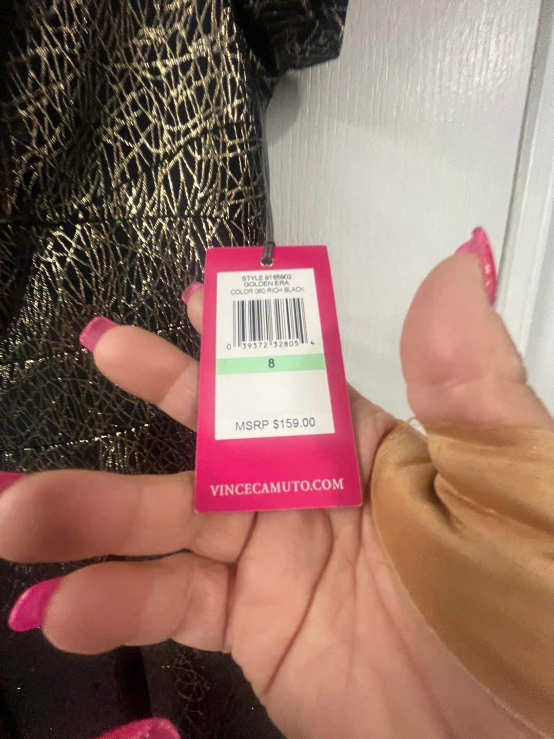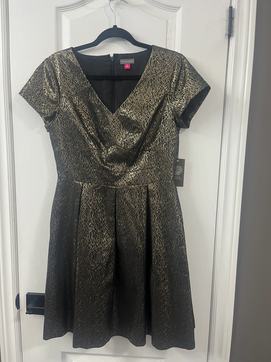 This is a Vince Camuto dress in the Golden Era style. It's a size 8 and features a beautiful black and gold colour. The original price was $159.00