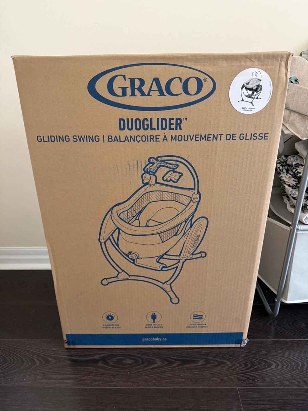 Selling a brand new Graco DuoGlider Gliding Swing, still in its original box! It features 6 gliding speeds, 2-speed vibration, and plush body support. It also has 15 songs and sounds to soothe your little one. Option to plug in or use batteries. Perfect for keeping baby happy and relaxed!
