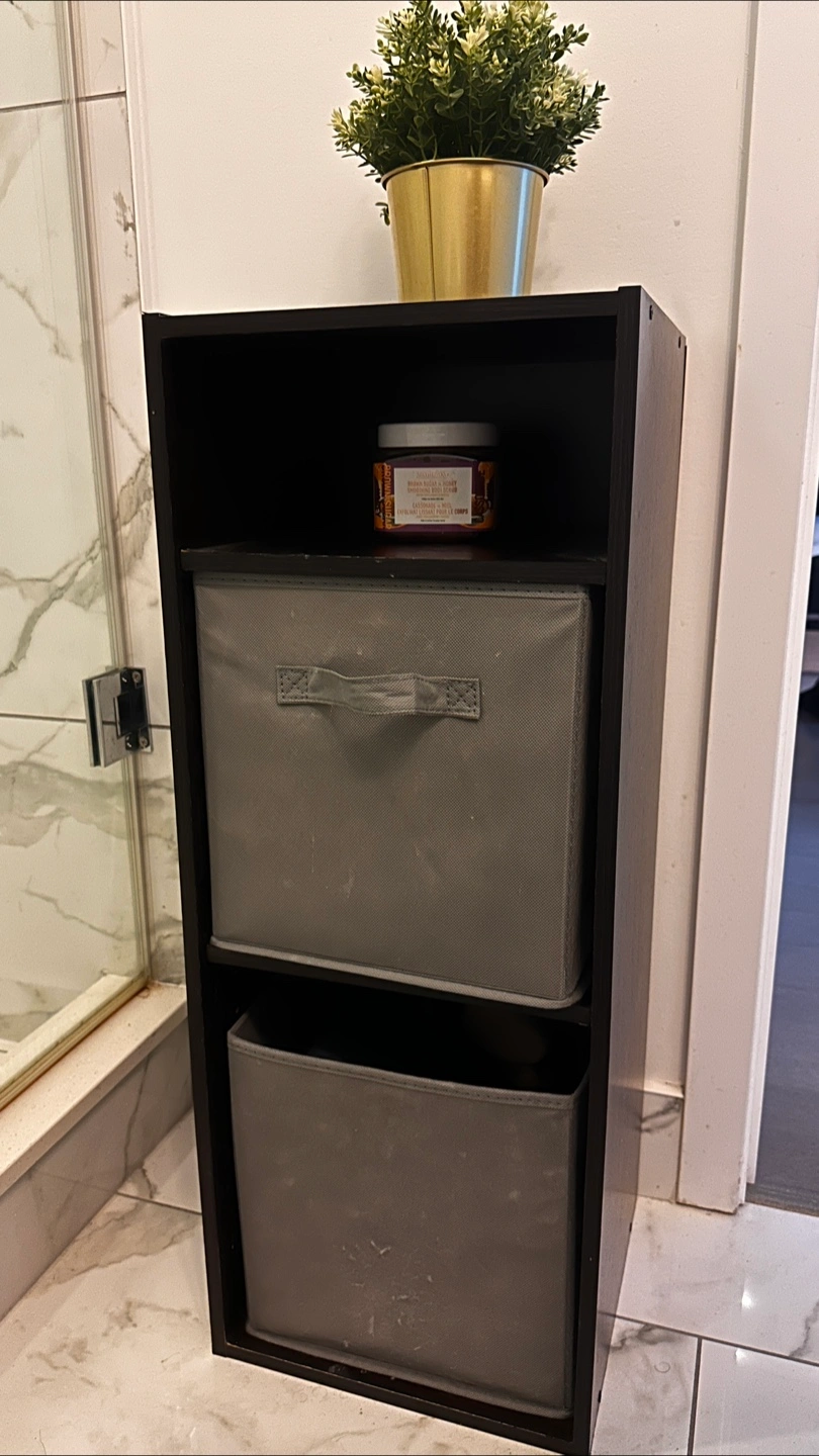 Selling a black storage shelf unit. It's in good condition and perfect for organizing your space. The unit features open shelving and space for storage bins. Great for any room in the house! I am selling without grey box
