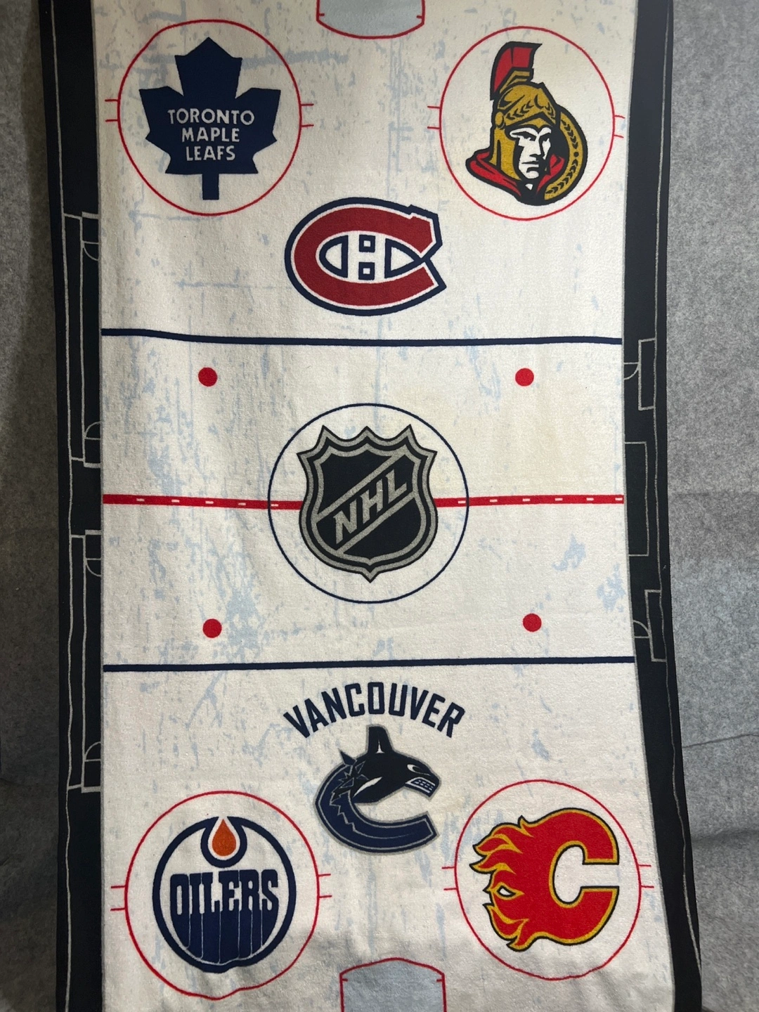 Brand New Towel featuring the logos of various NHL hockey teams! It includes the Toronto Maple Leafs, Ottawa Senators, Montreal Canadiens, Vancouver Canucks, Calgary Flames, and Edmonton Oilers, plus the NHL logo itself