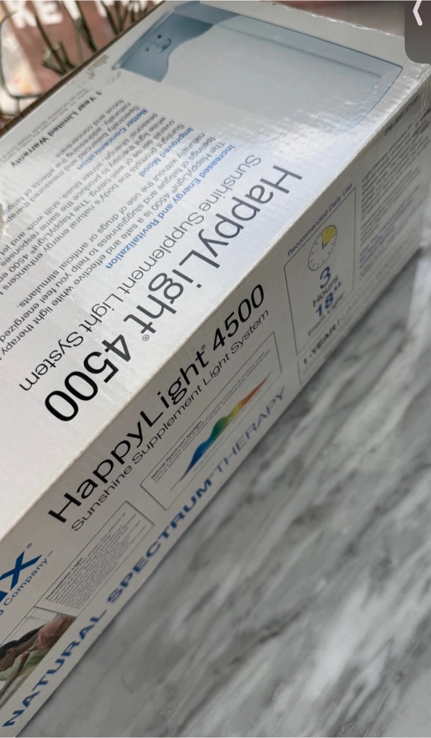 I'm selling a Verilux HappyLight 4500 Sunshine Supplement Light System. It's designed to simulate sunlight and help boost your mood and energy. The box is included!
