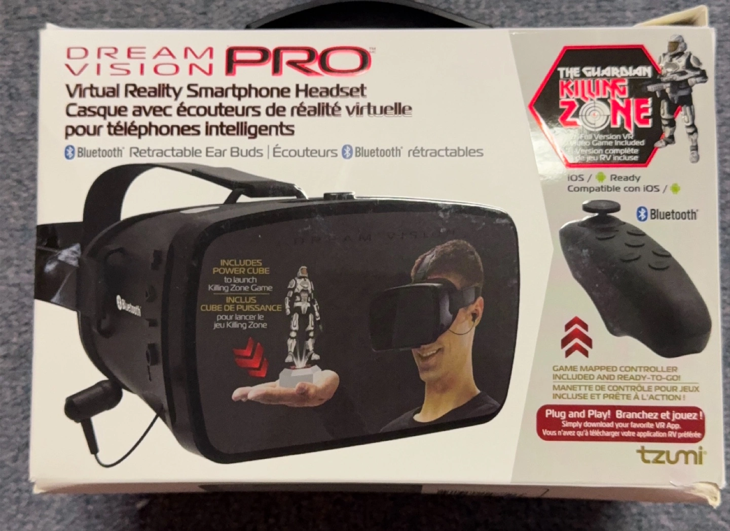 This one is just sitting in my garage and my kids doesn’t play with it. Barely used and in good condition, just message me if you want it…. Get ready to dive into virtual reality with this Dream Vision Pro VR headset! It comes with retractable earbuds and a game-mapped controller for an immersive experience. The box also mentions it includes a Power Cube to launch the Killing Zone game. Compatible with iOS devices. Plug and play, just download your favourite VR app and you're good to go