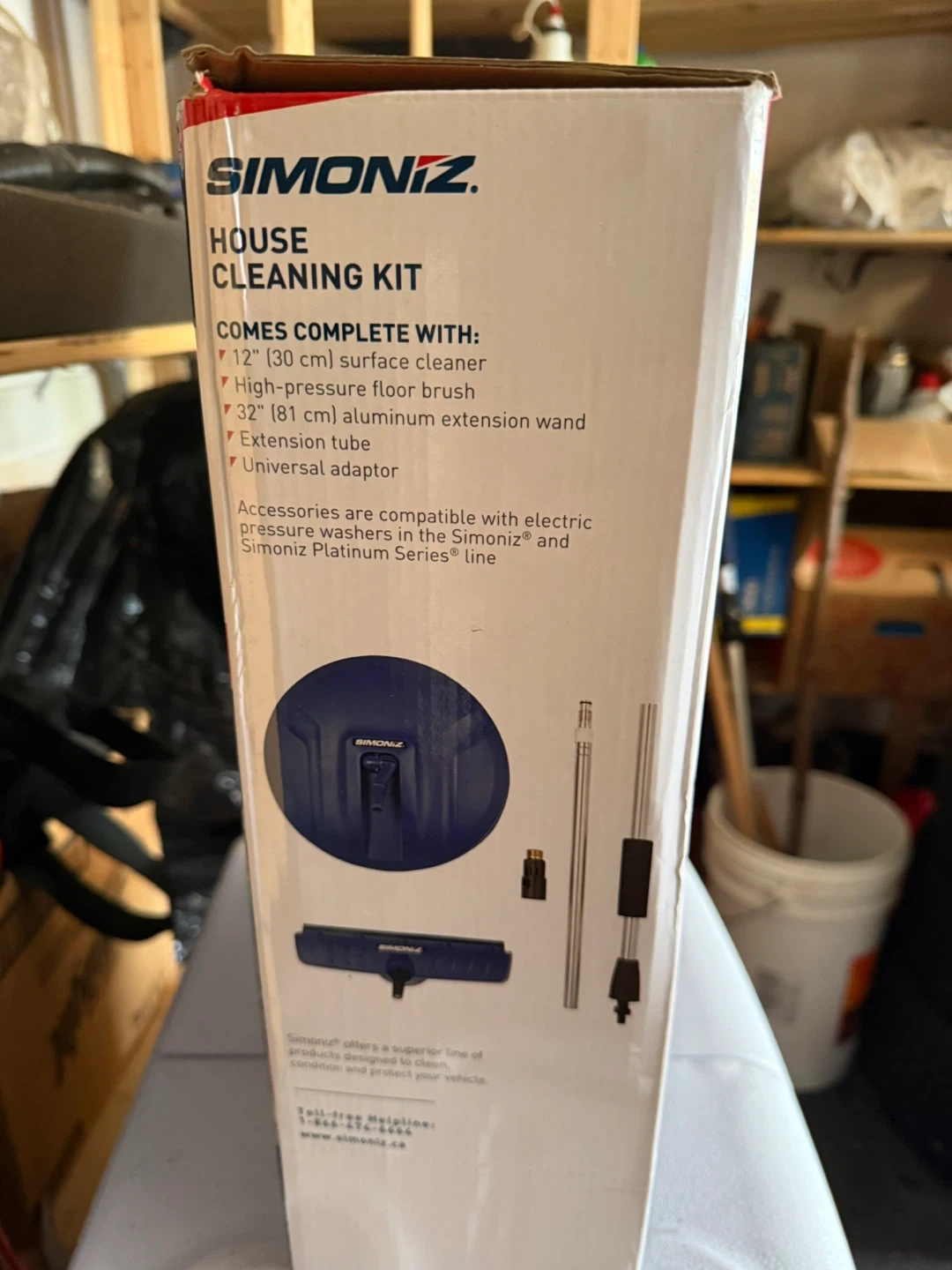 This SIMONIZ electric pressure washer floor cleaning kit comes with a 12" (30 cm) surface cleaner and a 32" (81 cm) aluminum extension wand. It includes a high-pressure floor brush and a universal adapter. This kit is compatible with electric pressure washers.