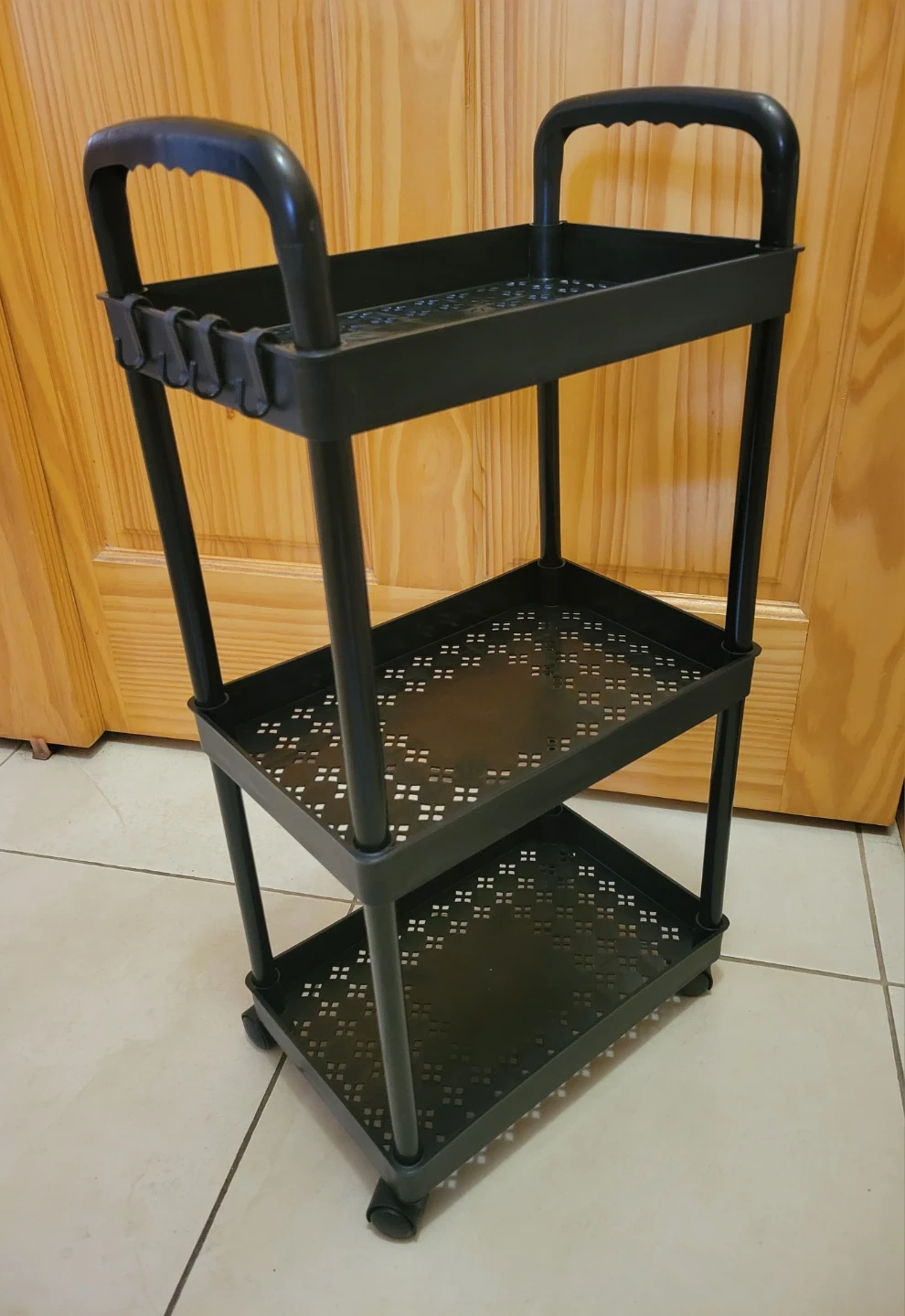 This is a black 3-tier rolling cart. It's made of plastic and includes wheels for easy movement. The shelves have a perforated design. It's useful for organizing items in tight spaces. New, never used