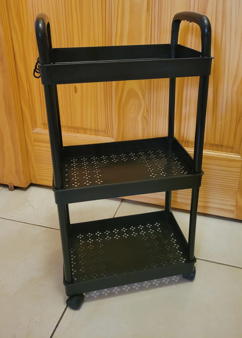This is a black 3-tier rolling cart. It's made of plastic and includes wheels for easy movement. The shelves have a perforated design. It's useful for organizing items in tight spaces. New, never used