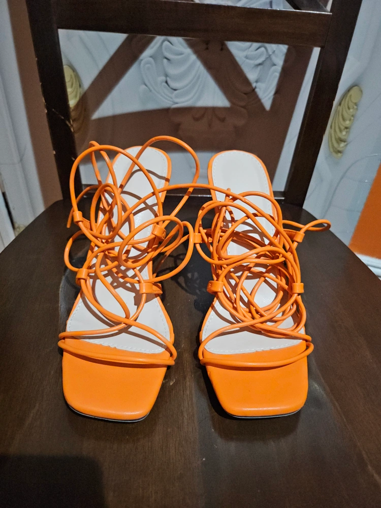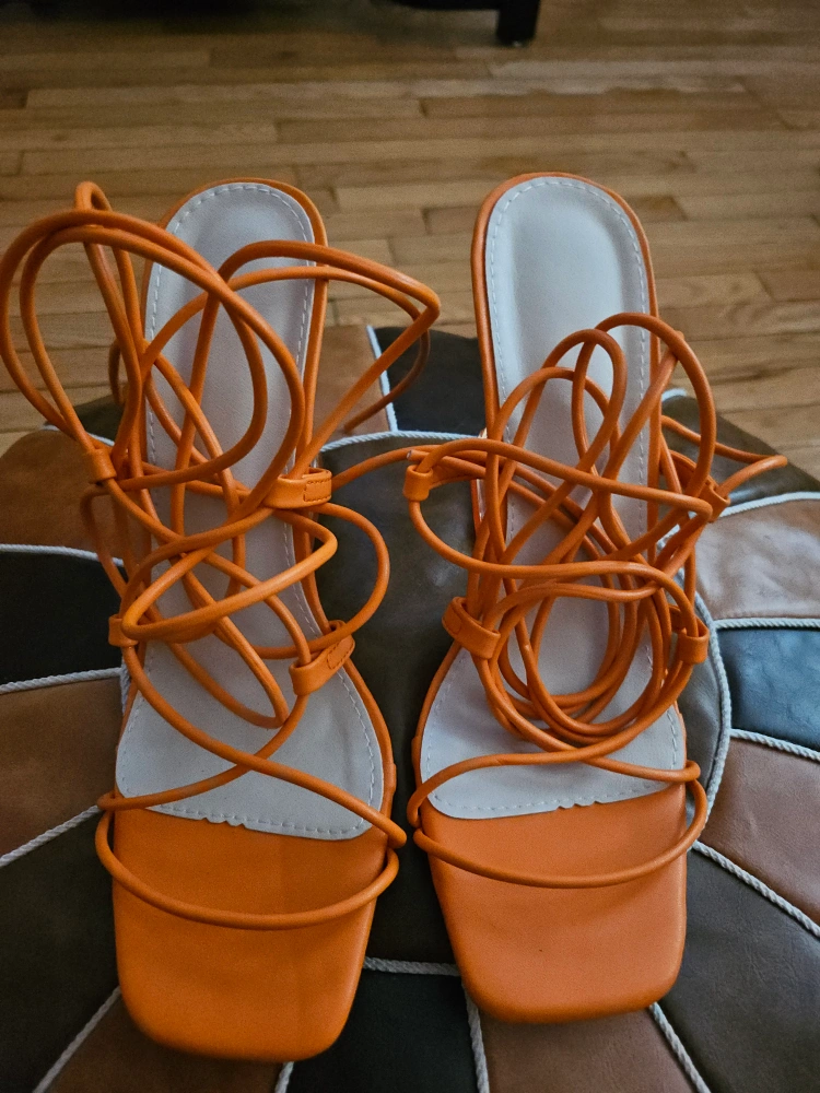 These are a pair of fun orange heels with a clear block heel and lace-up straps. They're in great condition and ready for a new home!