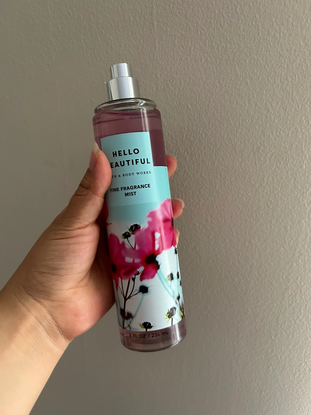 748FREE a Bath & Body Works Fine Fragrance Mist in the Hello Beautiful scent! It contains 8 fl oz / 236 ml. This mist is lightweight and portable, perfect for on-the-go freshness. Probably sprayed twice and lost the cap