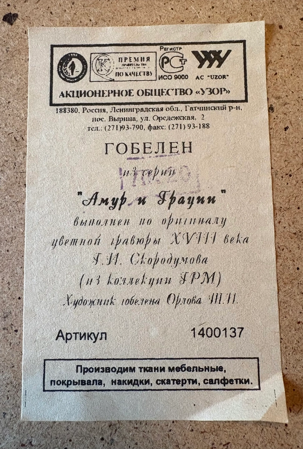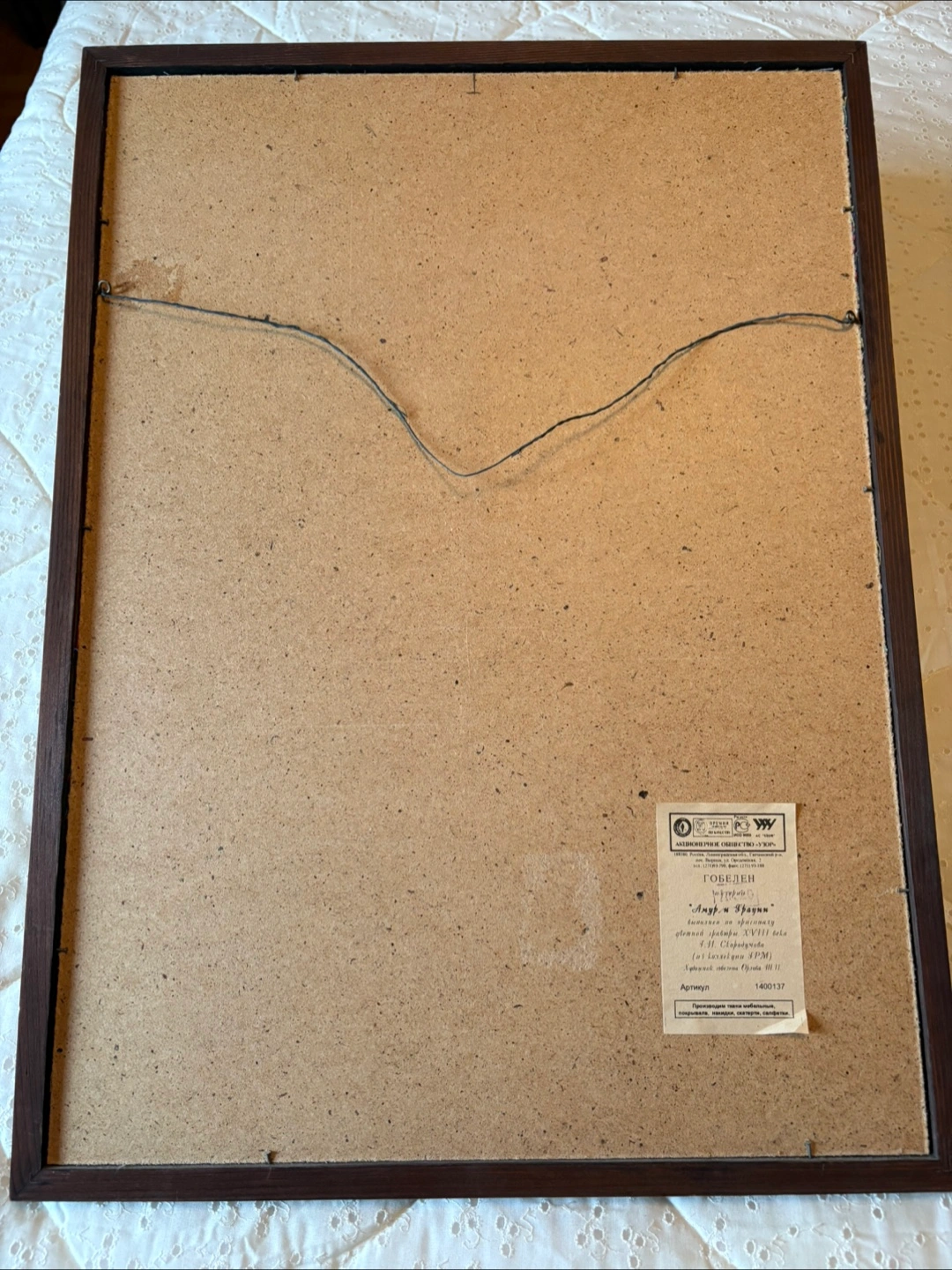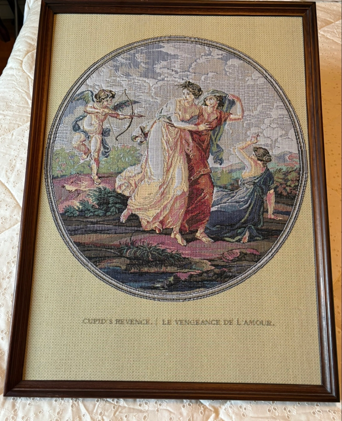 Here's a framed tapestry featuring a classical scene titled "Cupid's Revenge / Le Vengeance De L'Amour"! It's a beautiful piece of wall art with a wooden frame. The tapestry measures approximately 16 inches wide and 22 inches tall, making it a great size for adding a touch of elegance to any room