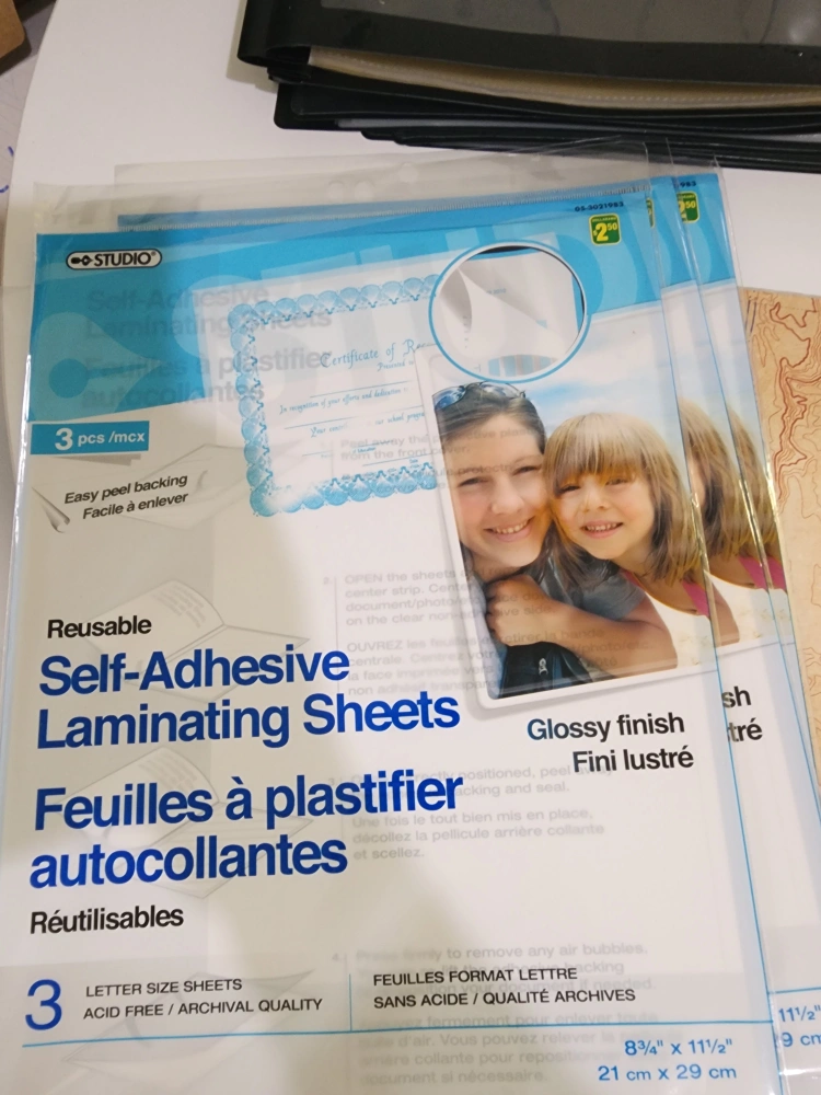 Studio self-adhesive laminating sheets, letter size. Includes 3 sheets with easy peel backing and archival quality. Also included are various sheets of paper and a binders for students or creativity. Giving to any artists