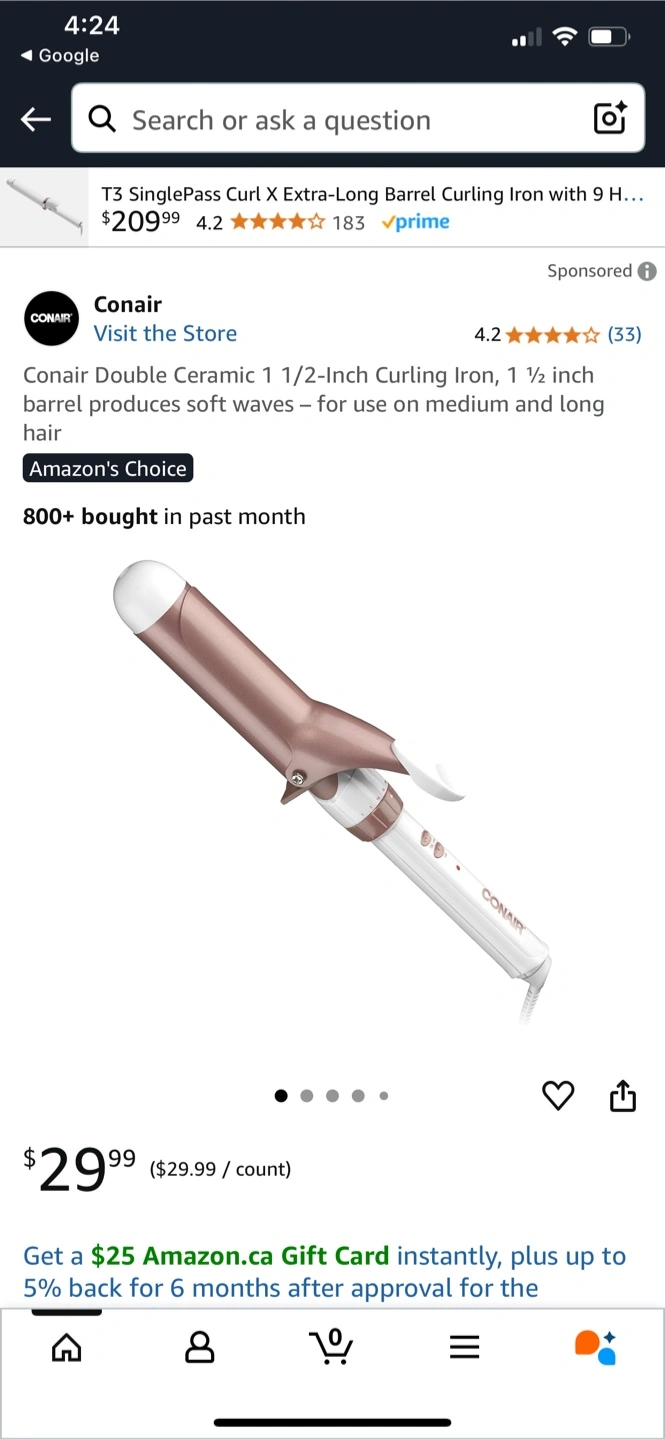 I'm selling a Conair Double Ceramic 1 1/2-inch curling iron. It's designed to produce soft waves and is suitable for use on medium and long hair. It was originally bought for $29.99