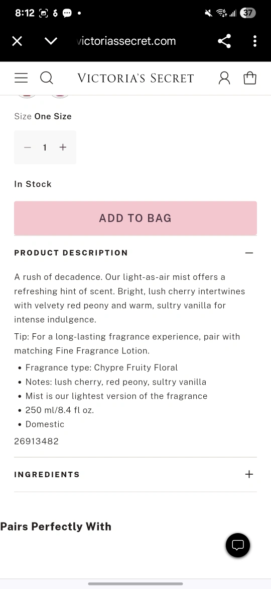 The Bombshell Intense is 250 ml/8.4 fl oz and features notes of lush cherry, red peony, and sultry vanilla. The Bodacious Eau de Parfum is 100mL/3.4oz and has top notes of Anjou pear, pink pepper, and lotus.