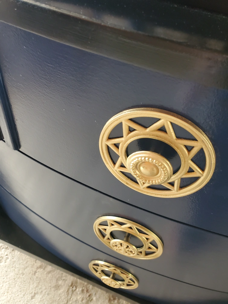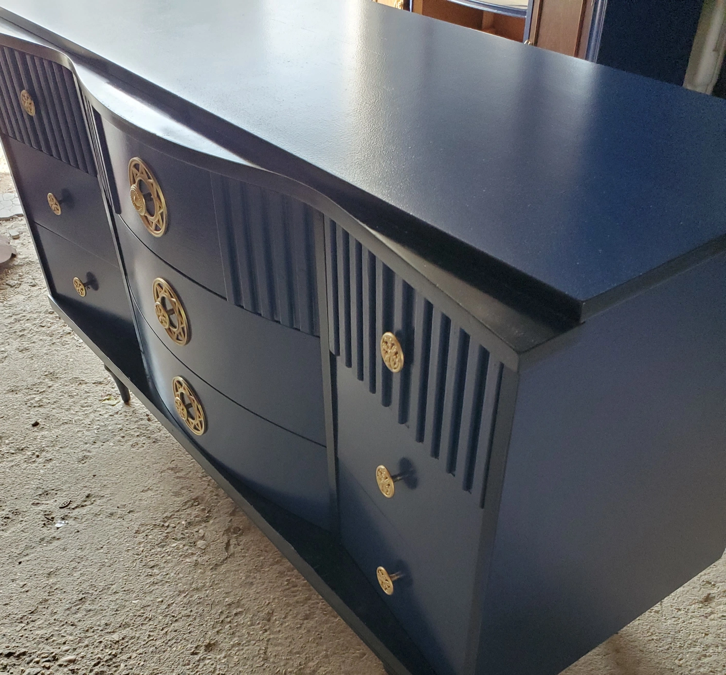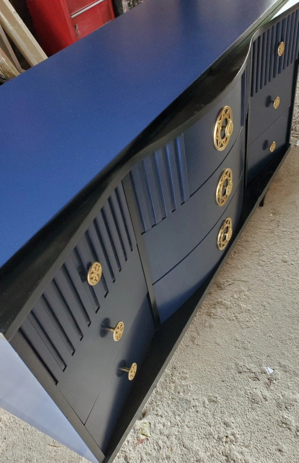 Here's a lovely Viscol dresser! It features a unique design with eye-catching gold handles. The dimensions are 54 inches wide, 20 inches deep, and 30 inches high, making it a great addition to any bedroom or living space