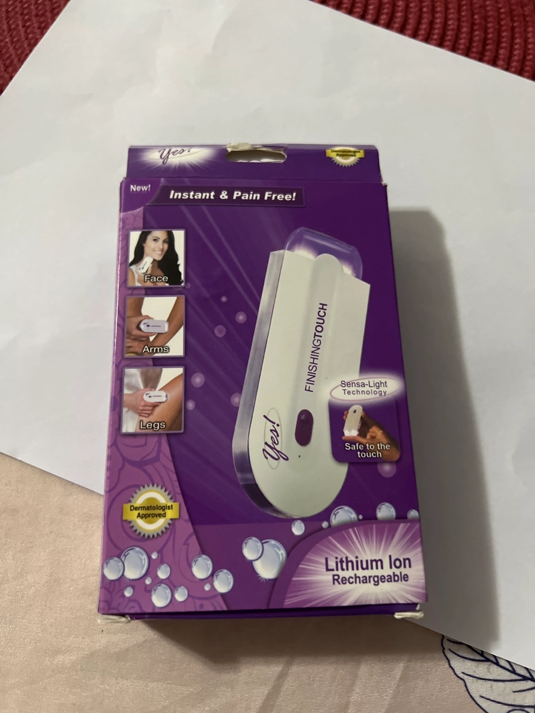 Selling a brand new Yes! Finishing Touch hair remover. It's instant and pain-free, perfect for face, arms, and legs. This hair remover features Sensa-Light Technology and is safe to the touch. It's also lithium-ion rechargeable and dermatologist approved. Comes in its original box!