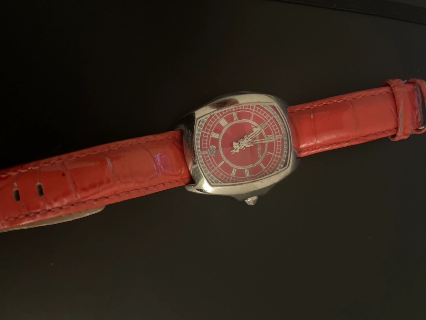 Selling a watch with a red leather strap! The watch face is a unique shape and design. It's in good condition and ready for a new owner