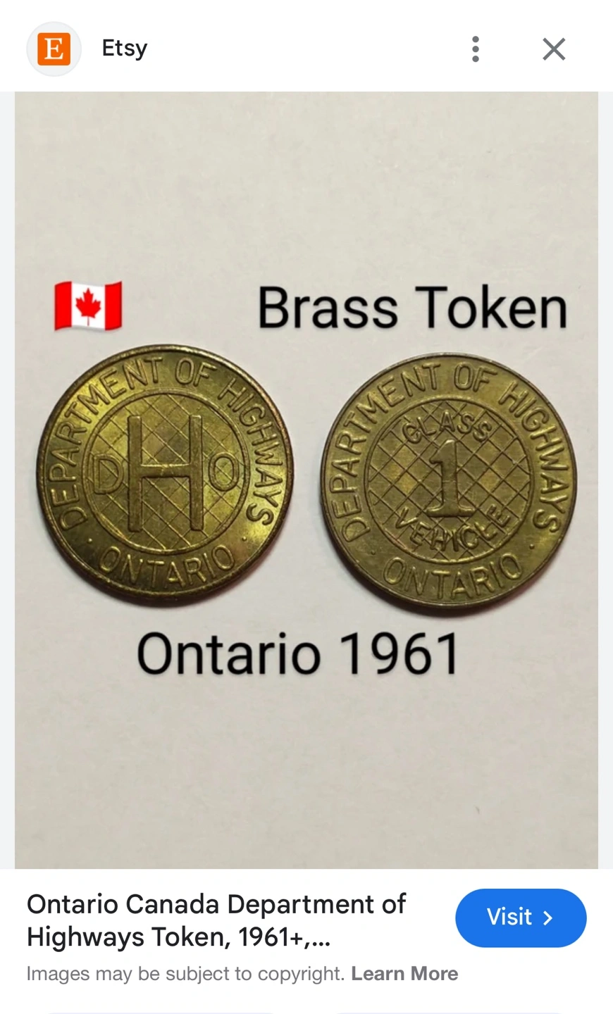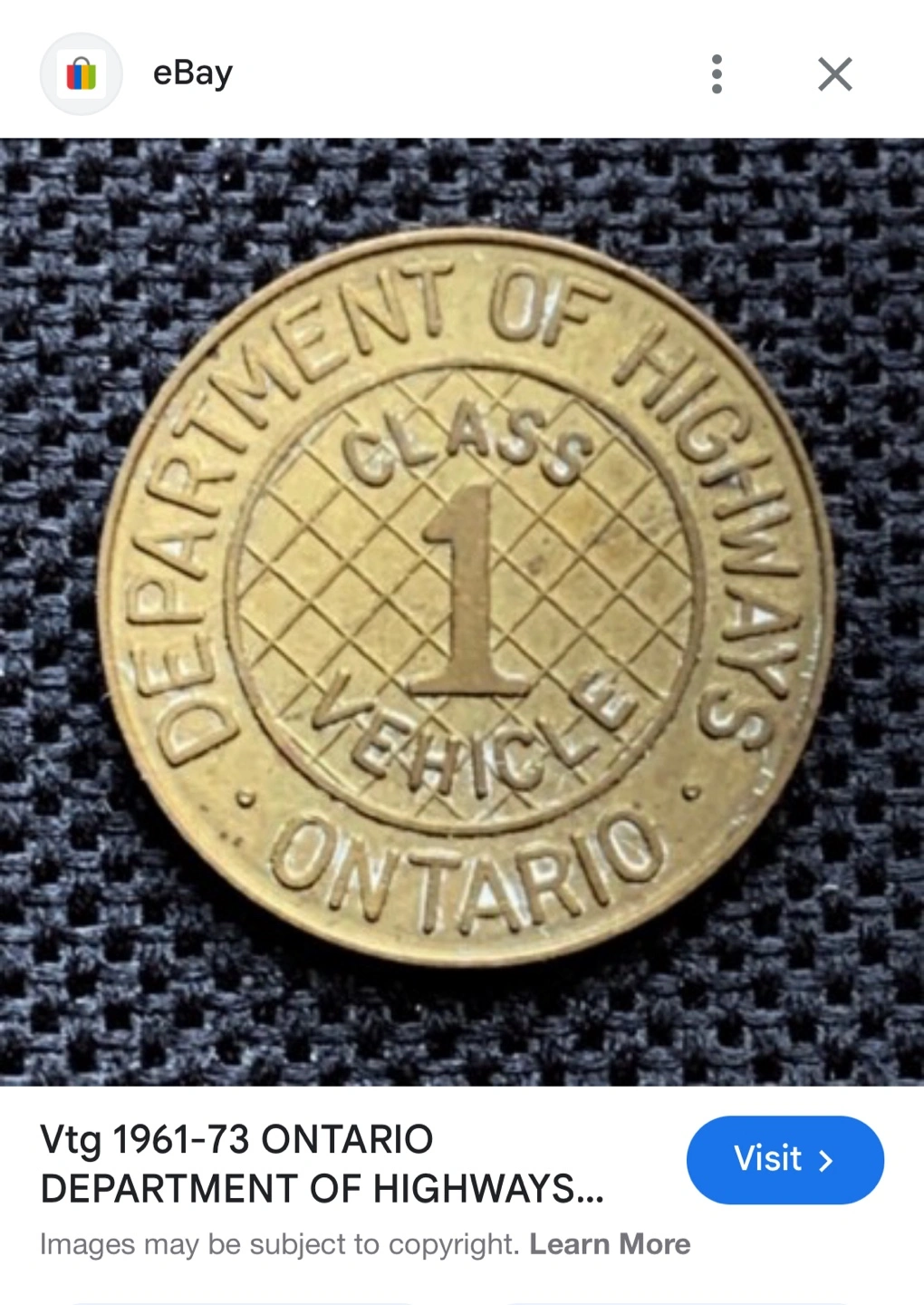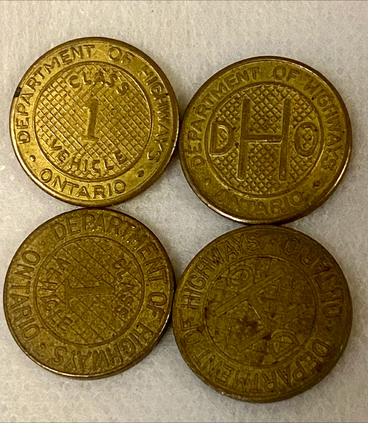 Selling vintage Ontario Department of Highways tokens! These tokens are a piece of Ontario's history, dating back to the 1960s and 1970s. They feature the Department of Highways logo and markings, a neat collectible for anyone interested in Ontario's past