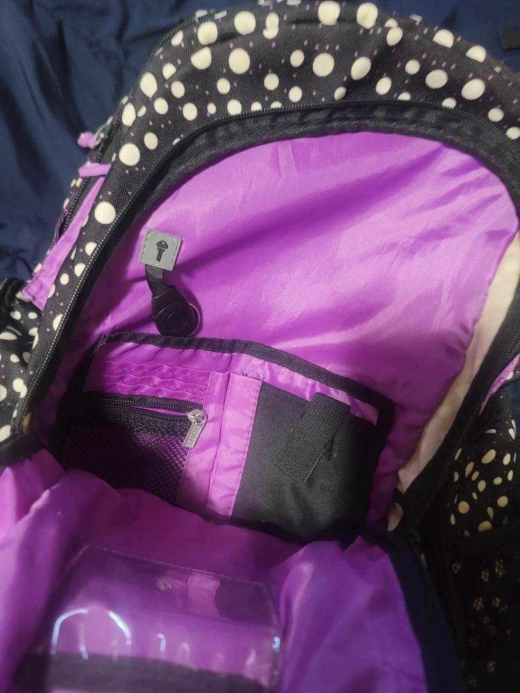 This Roots backpack is in great shape and ready for a new home! It's black with white polka dots and has purple accents. It's got lots of pockets and compartments to keep everything organized, perfect for school or travel. It does have a small tear in the bottom of the netted pocket as shown in picture.