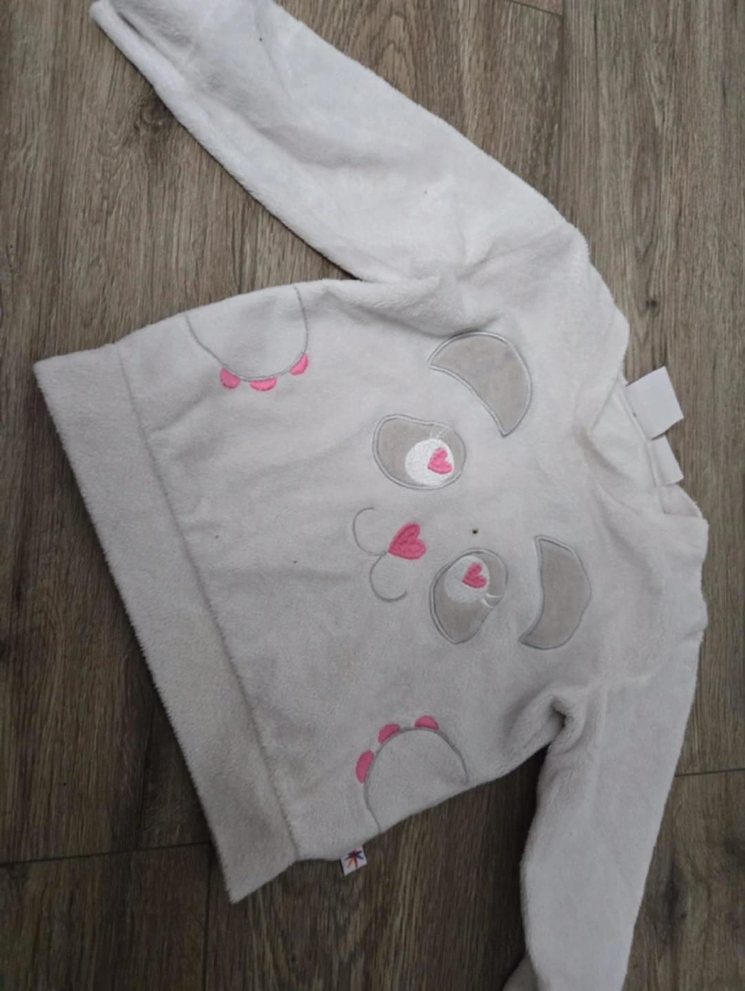 Selling a super cute white fleece pullover! It features an adorable animal design with pink accents. Perfect for keeping your little one warm and cozy.