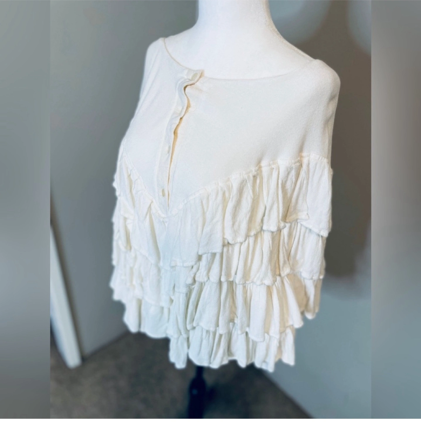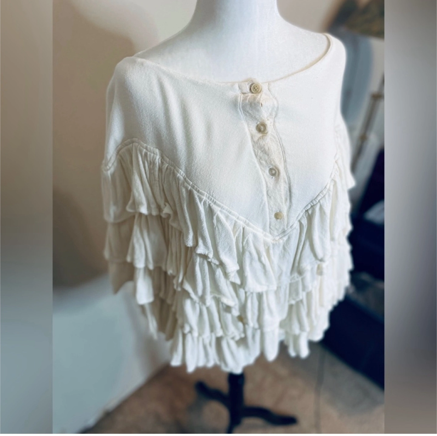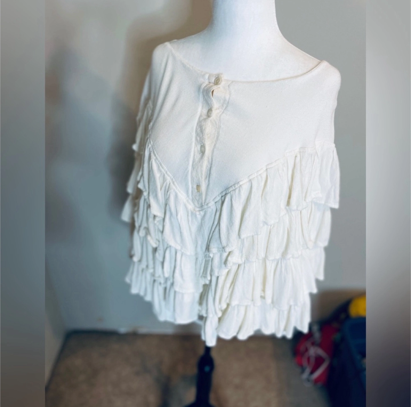 Ivory colour ruffle top Made in Morocco. Fits size M 60% Cotton 20% Rayon Perfect for adding a bit of flair to your wardrobe!