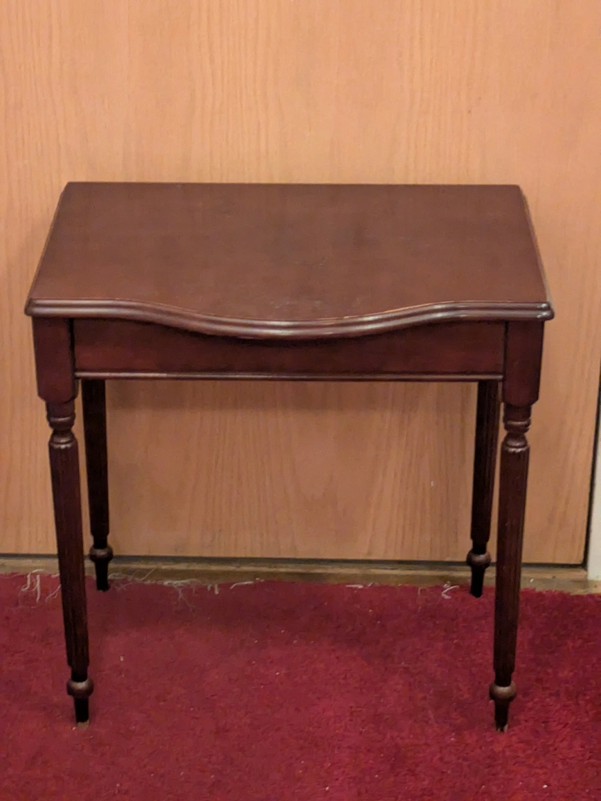 This used dark wood side table features a classic design with turned legs and a compact drawer, perfect for adding a touch of elegance to any room. Please note its used condition, with some cosmetic wear that adds to its vintage charm.