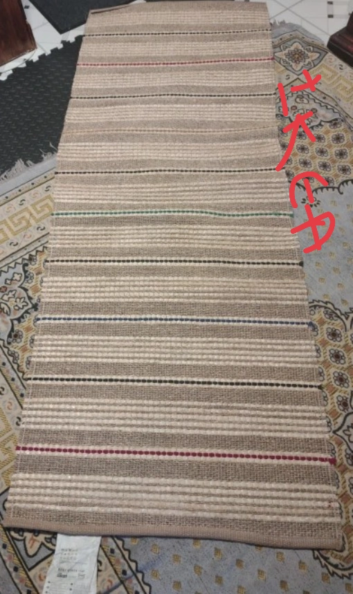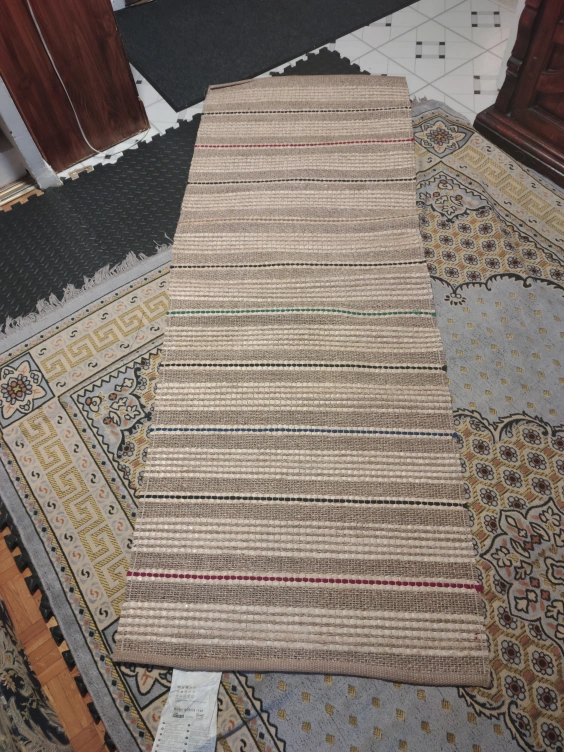 Selling a striped beige rug. It has a nice neutral tone with thin stripes of different colours. It's in good condition and would look great in any room