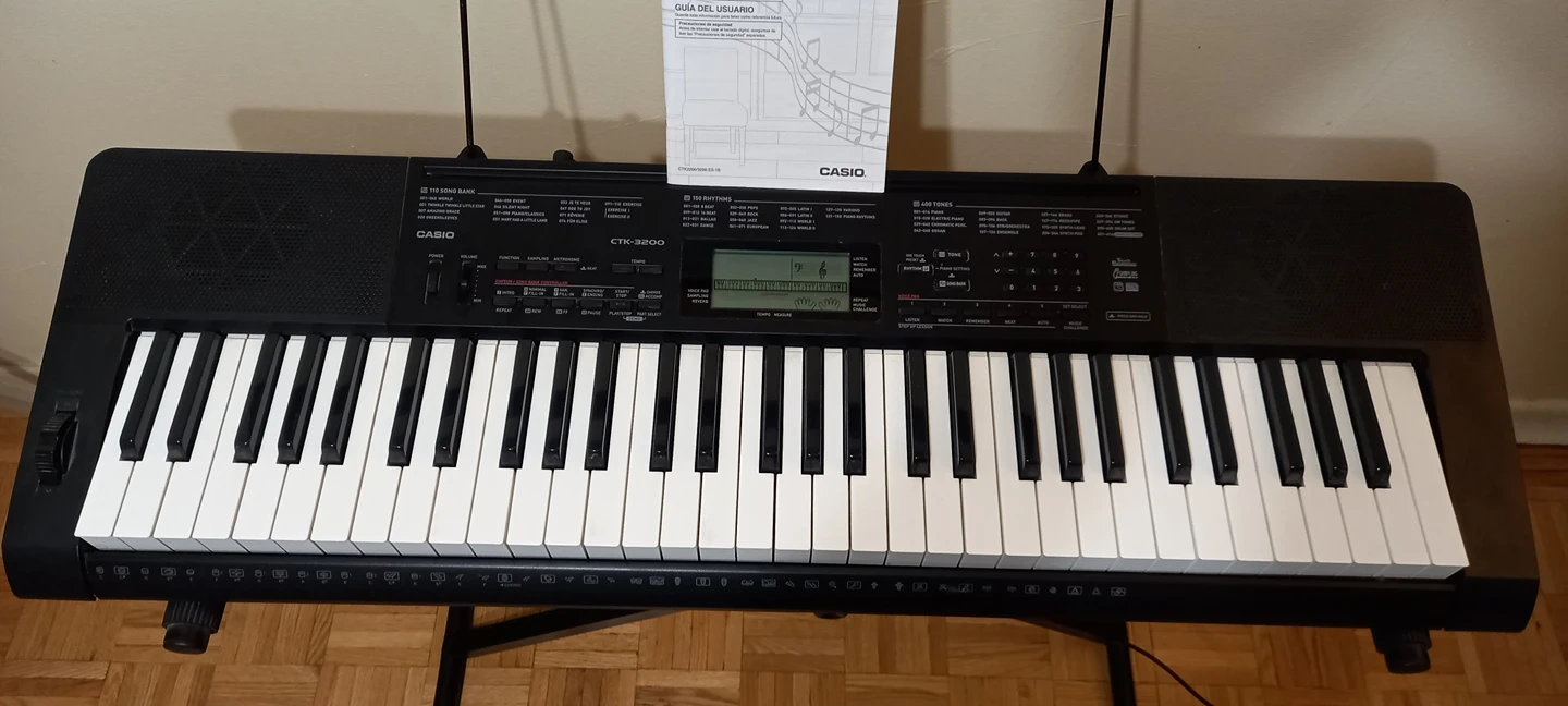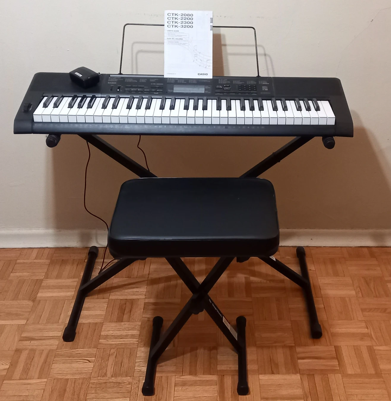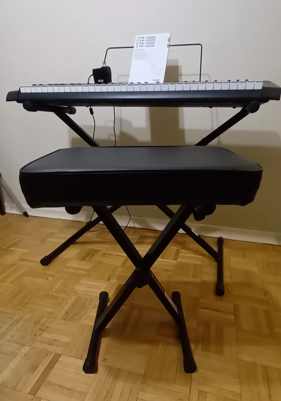 I have this Casio digital keyboard 61- key piano CTK 3200 for sale. It includes a power adapter, instruction manual, book stand, as well as the On Stage Stands brand soft padded bench (model KT7800 available online for 52.54) and the On Stage Stands keyboard stand ( KS7190 available online for 64.99). Both are adjustable to preferred height.