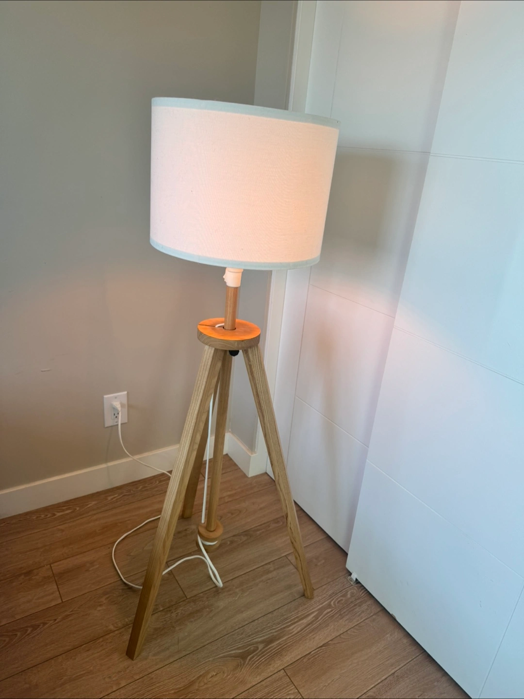 Selling a stylish tripod floor lamp! It would be a great addition to any room. The lamp features a light-coloured shade and a wooden tripod base. It's in good condition and ready to brighten up your space