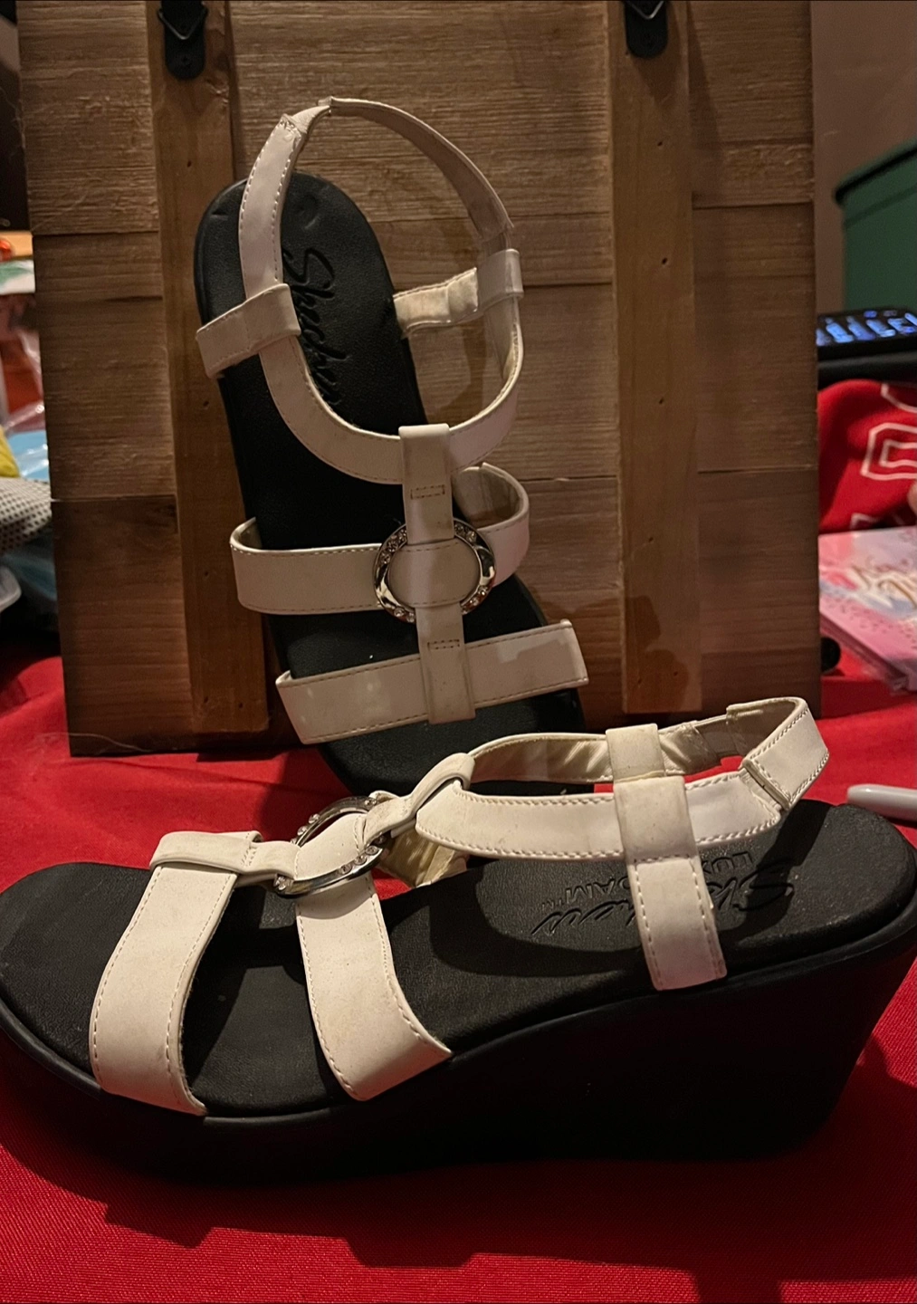 Selling a pair of Skechers wedge sandals. They are a cream/off-white colour with a black sole. Size 6.