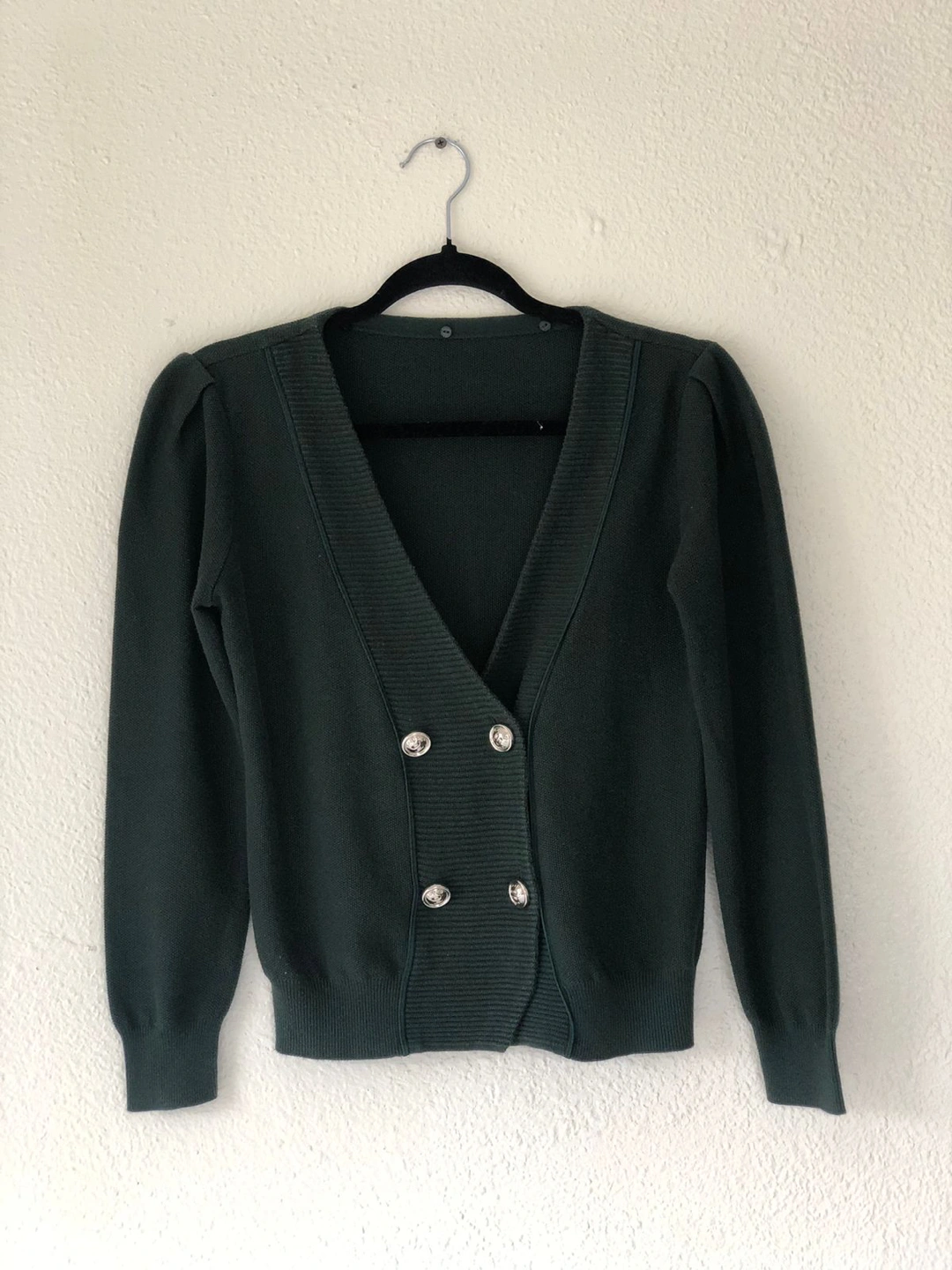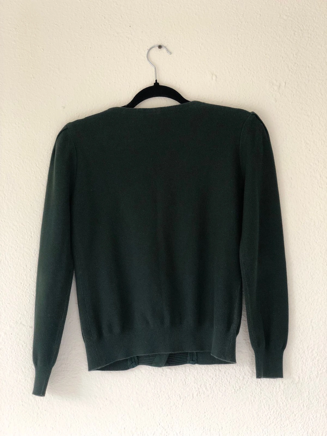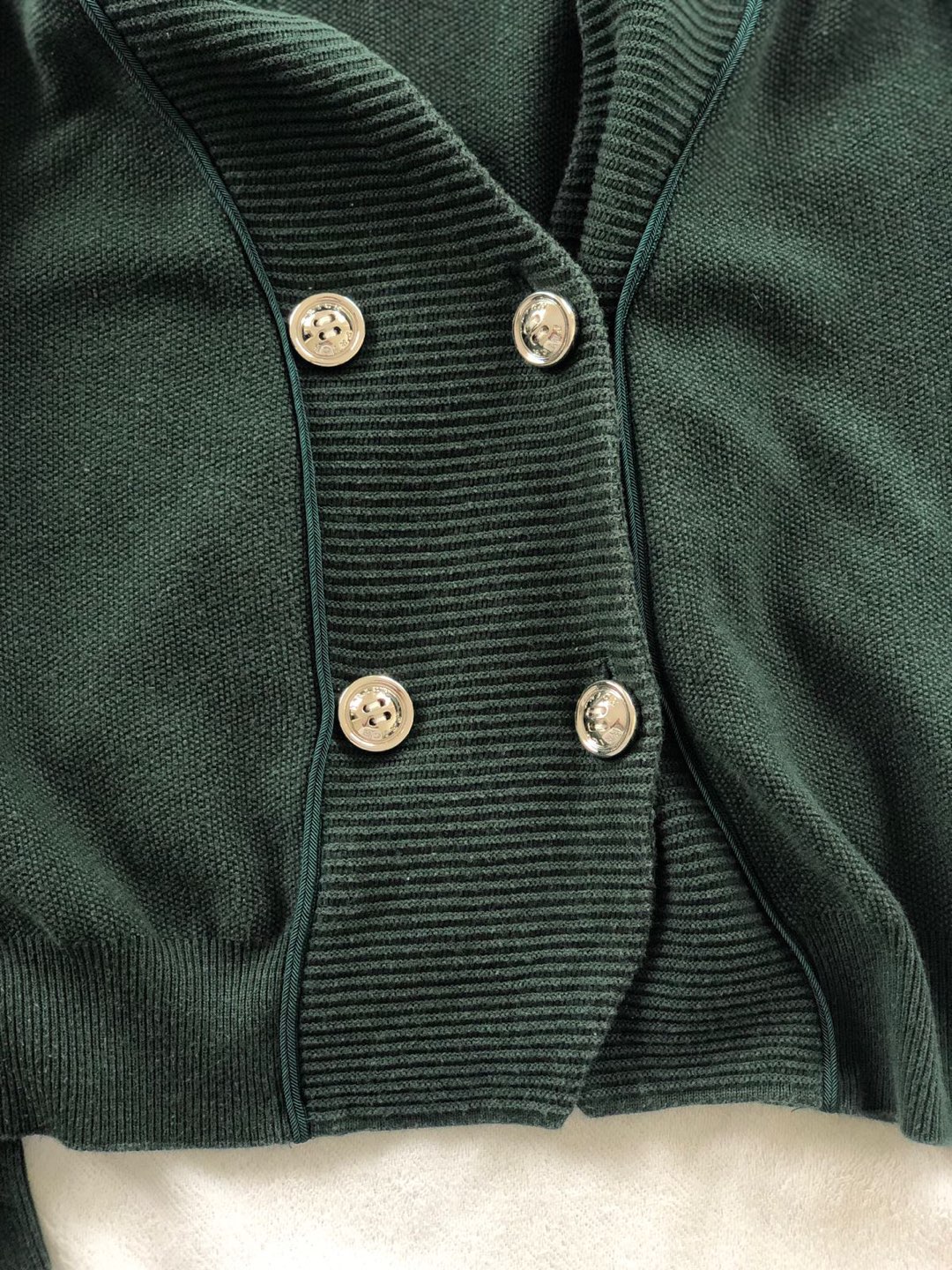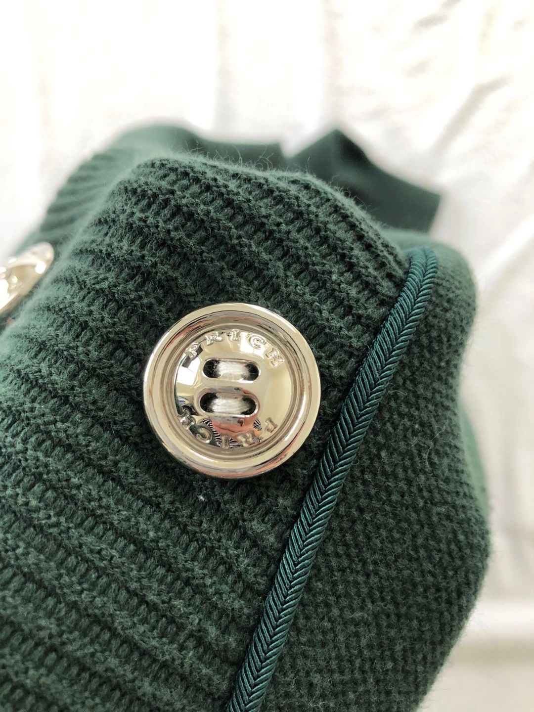 252Dark green crochet PRICH, sweater, pristine condition, with no stains or damage. Golden buttons which gives a touch of elegance to a beautiful piece like this. Details: -Shoulder: 38 cm -Chest: 45 cm -Waist: 43cm -Wrist:7 cm -Length down: 54cm