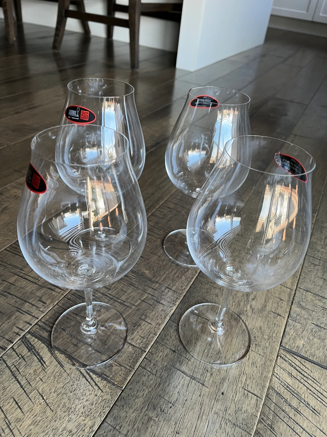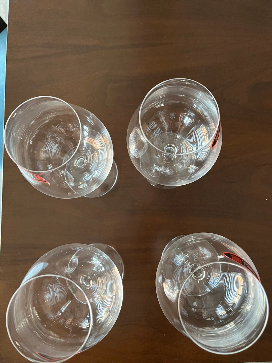 Selling a set of four Riedel crystal wine glasses. These are new and ready for your next dinner party or cozy night in. They're perfect for enjoying your favourite wine!