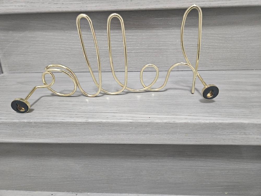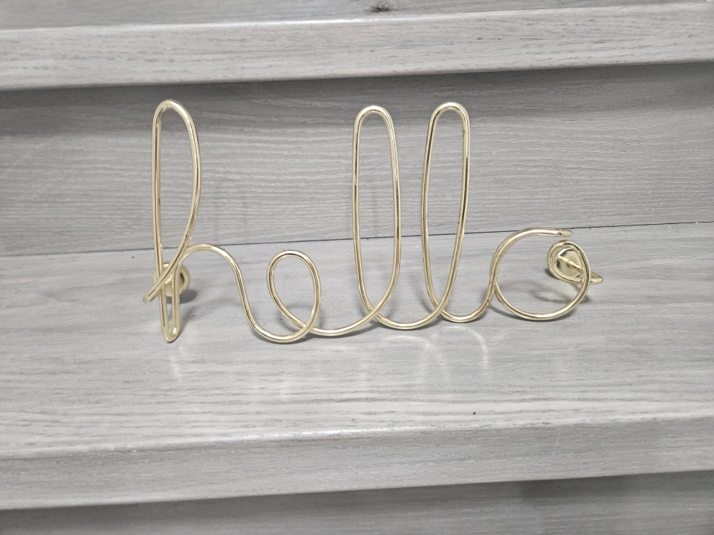 A cute and simple gold wire 'Hello' sign to add a touch of charm to any space! Perfect for a shelf, desk, or entryway, it's in great condition and ready to brighten up your home