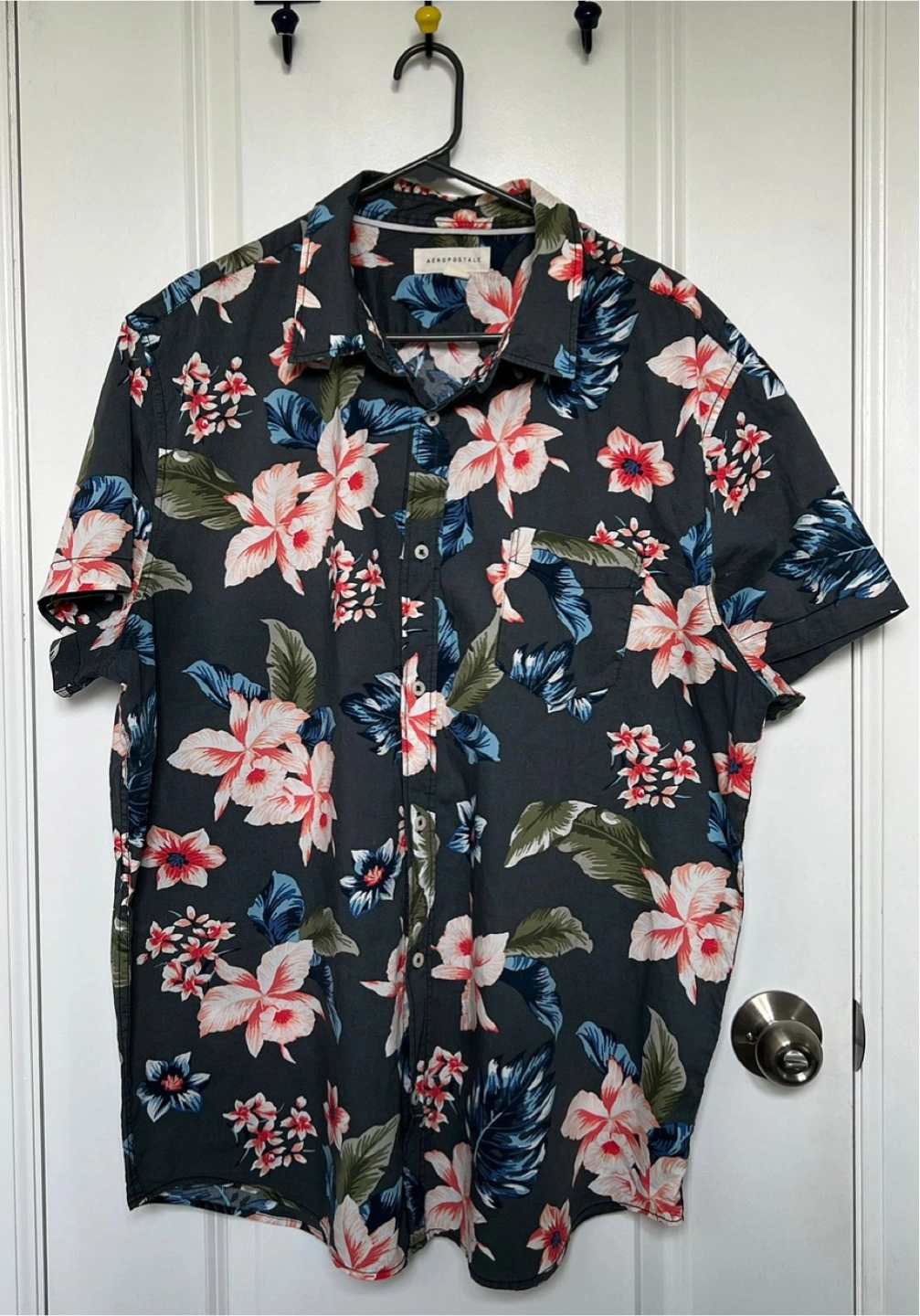 Selling an Aeropostale floral shirt in size 2XL. It's a button-down style with a vibrant floral pattern on a dark background. Perfect for adding a bit of fun to your wardrobe!