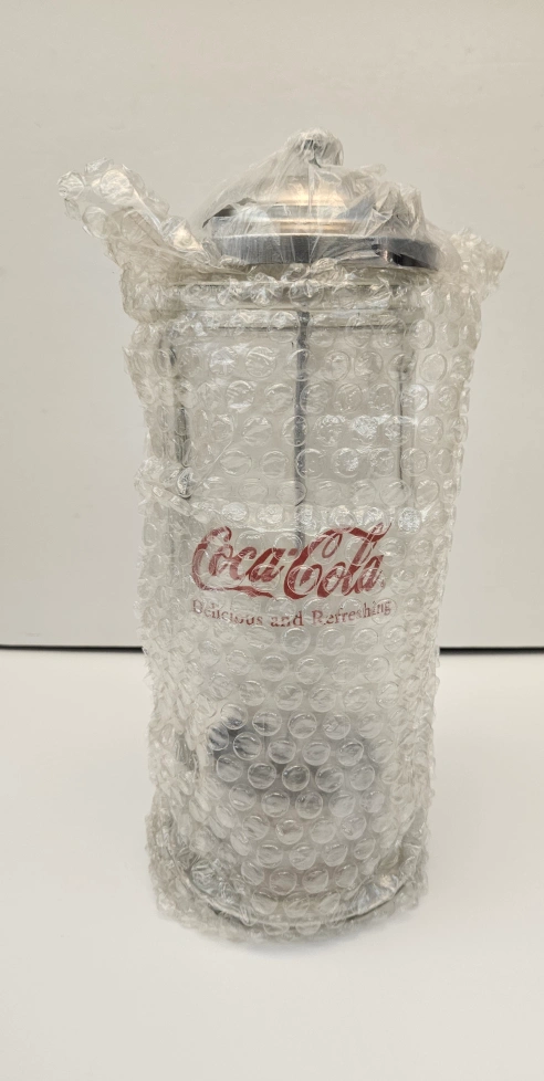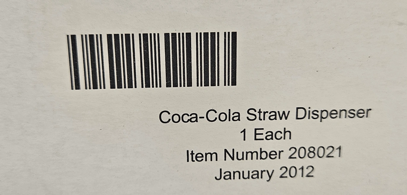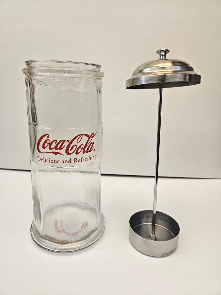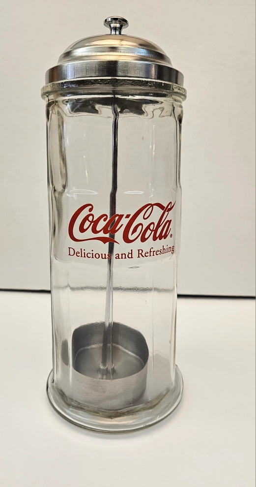I have for sale a Coca Cola straw dispenser which is brand new, it is glass with a tin top standing 9.5" tall, I am asking $10