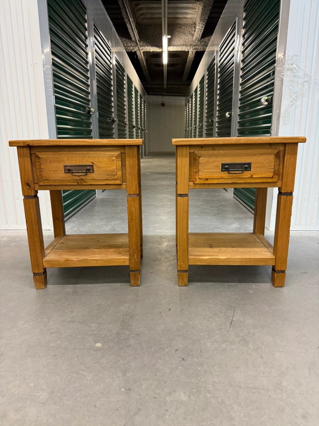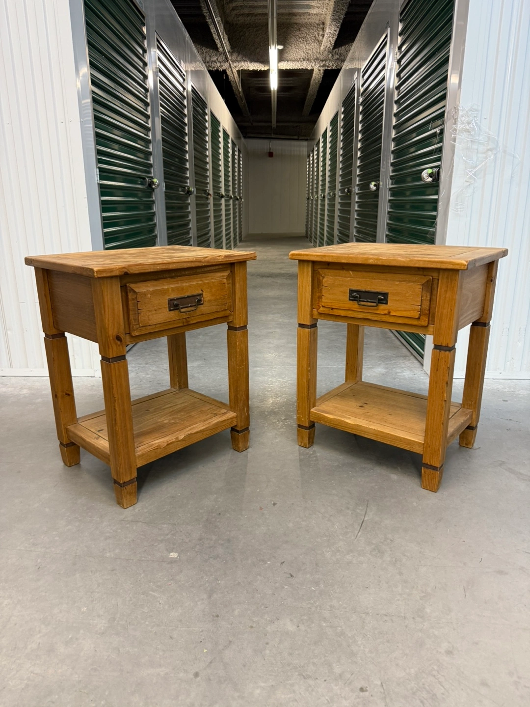 Selling a set of two wooden side tables from Pier 1 Imports. These tables feature a drawer and a lower shelf for storage. They are in good condition and would be a great addition to any room!