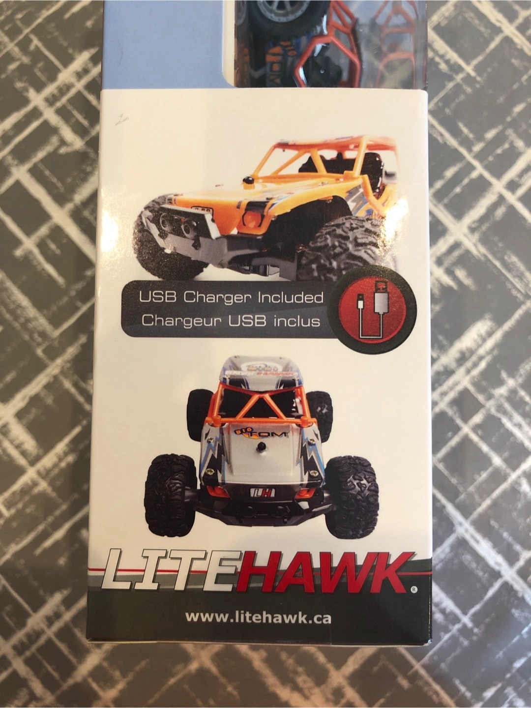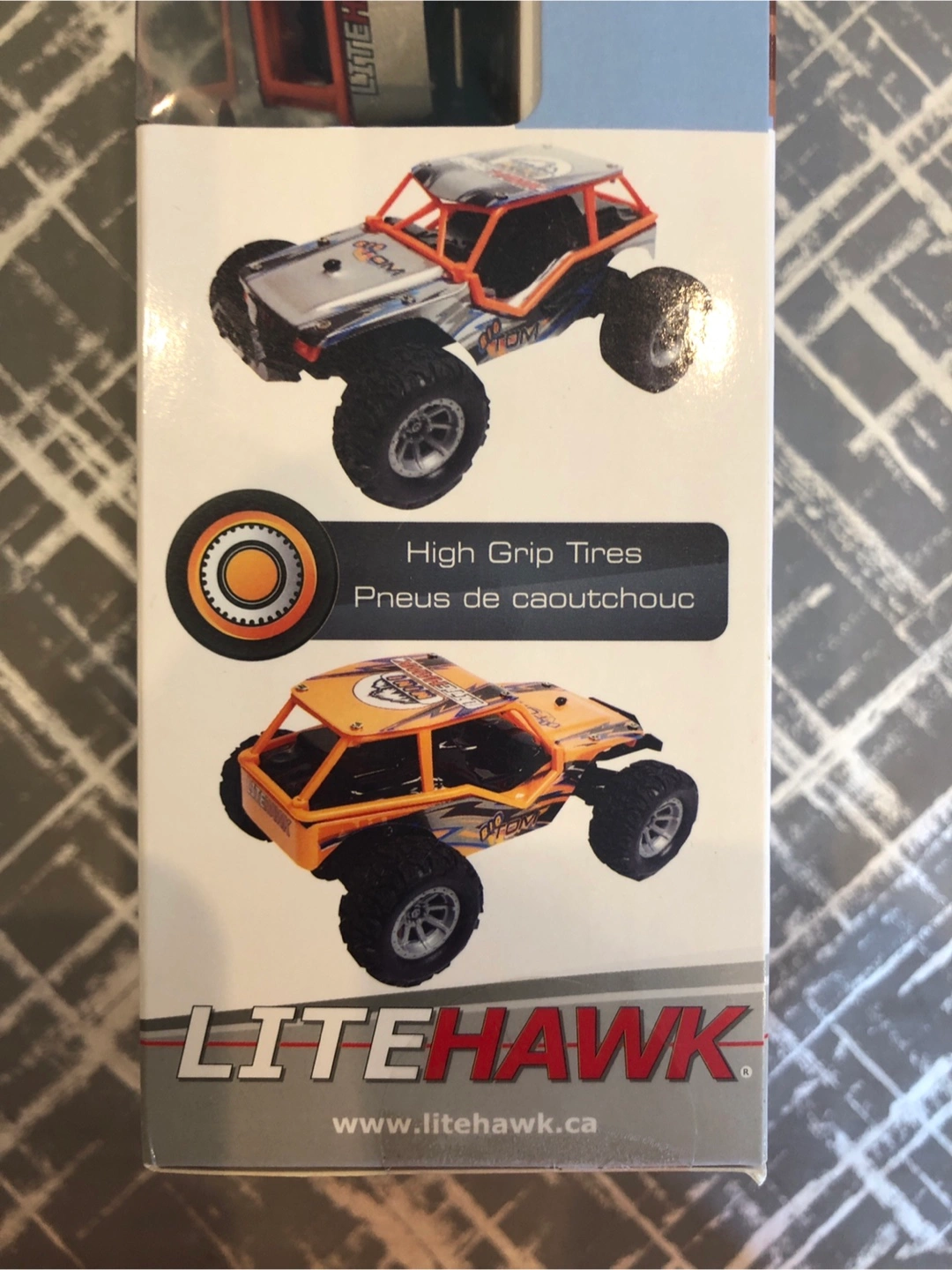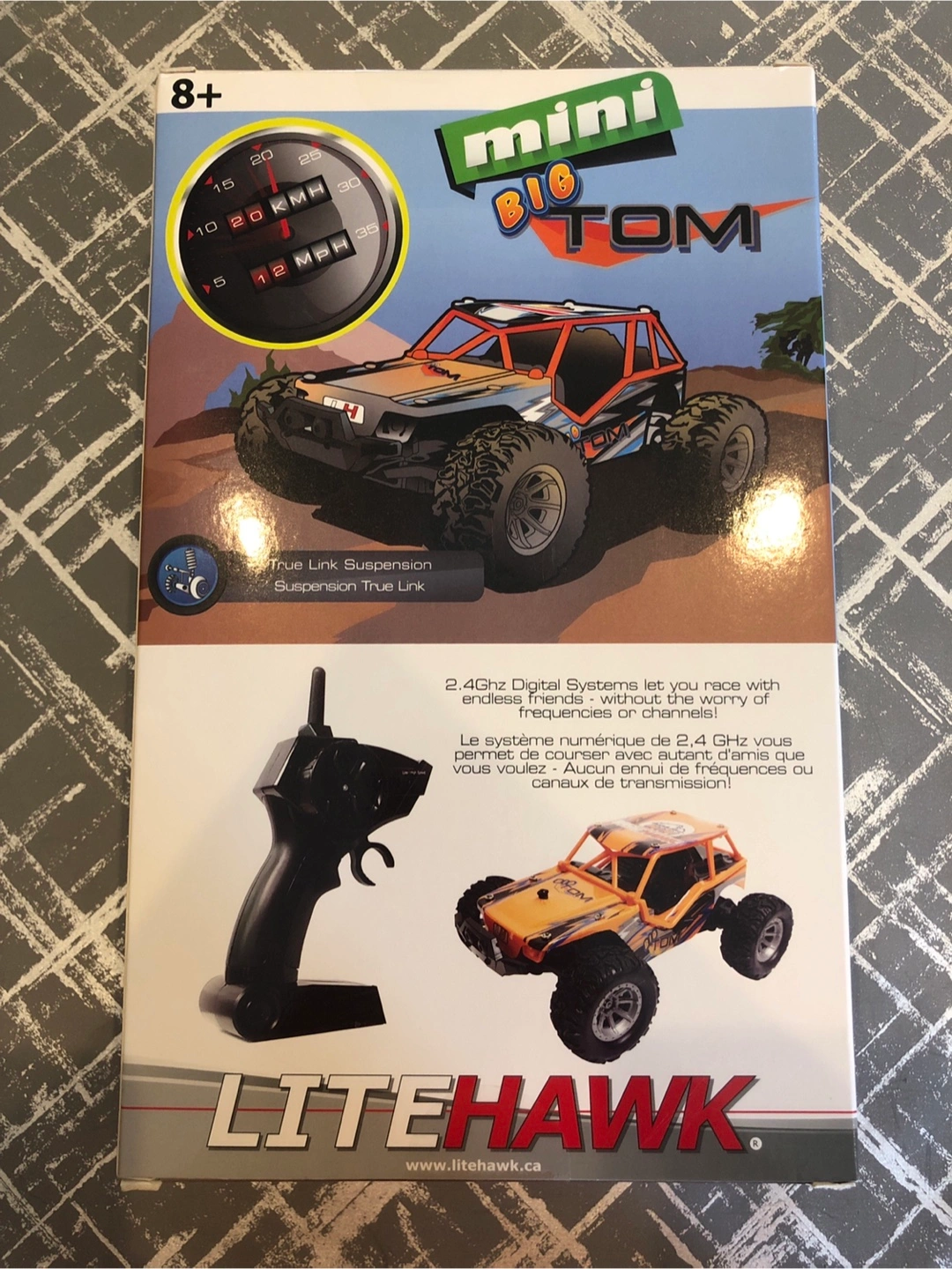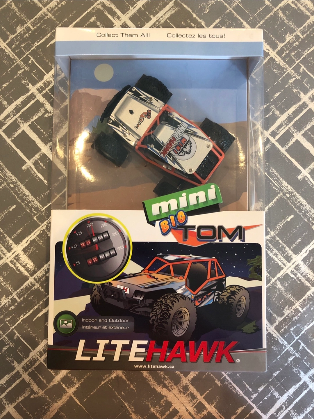 15Selling a brand new LiteHawk Mini Big Tom RC truck, still in its original packaging! It's suitable for ages 8 and up and is great for both indoor and outdoor use. The truck features tough and flexible Lexan body, rechargeable lithium battery, and high grip tires. Included is a USB charger. Collect them all!