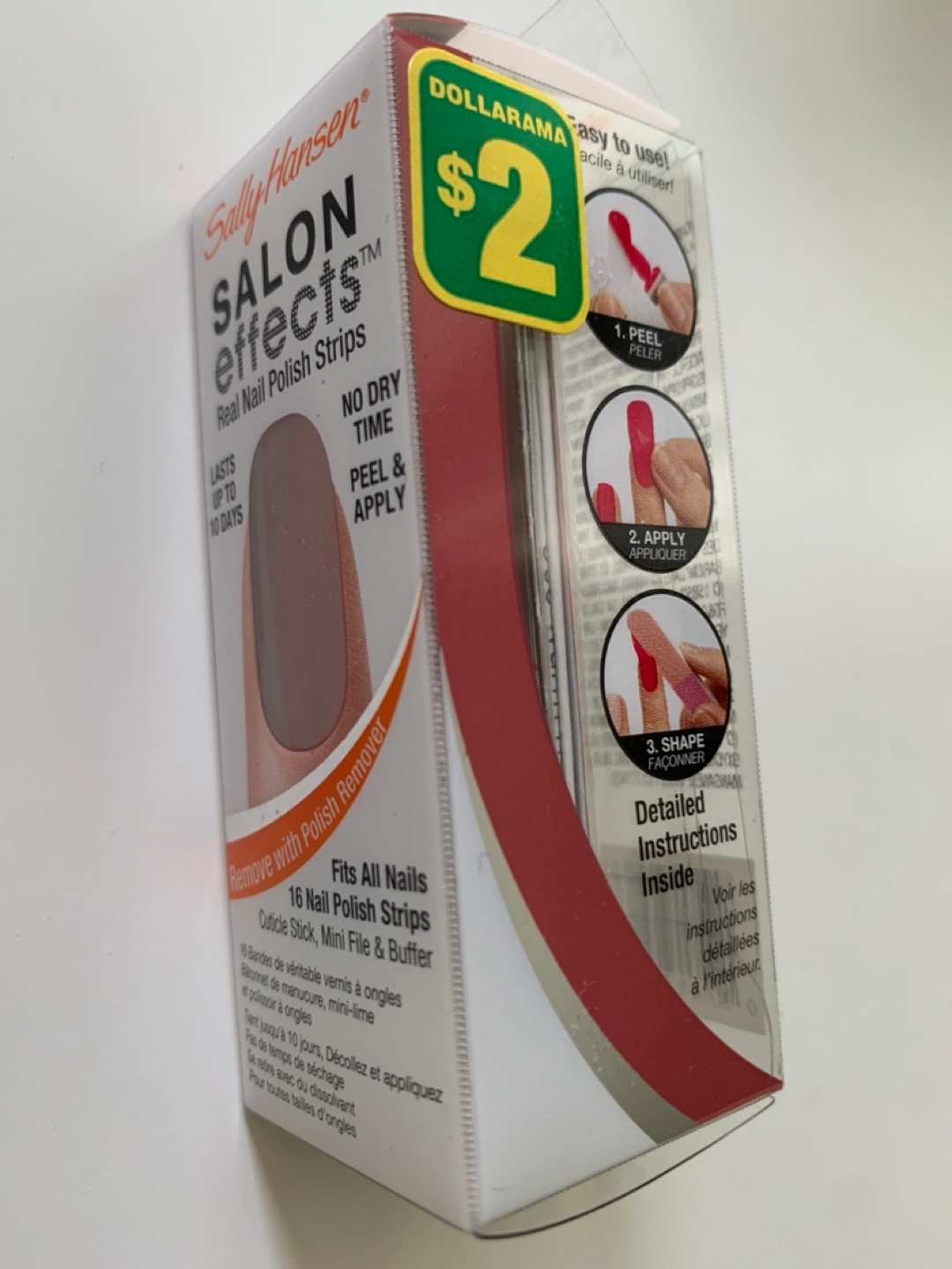 Get salon-quality nails at home with these Sally Hansen Salon Effects Real Nail Polish Strips! They're easy to apply – just peel and apply, with no dry time needed. Each pack fits all nails and includes 16 nail polish strips, a cuticle stick, a mini file, and a buffer