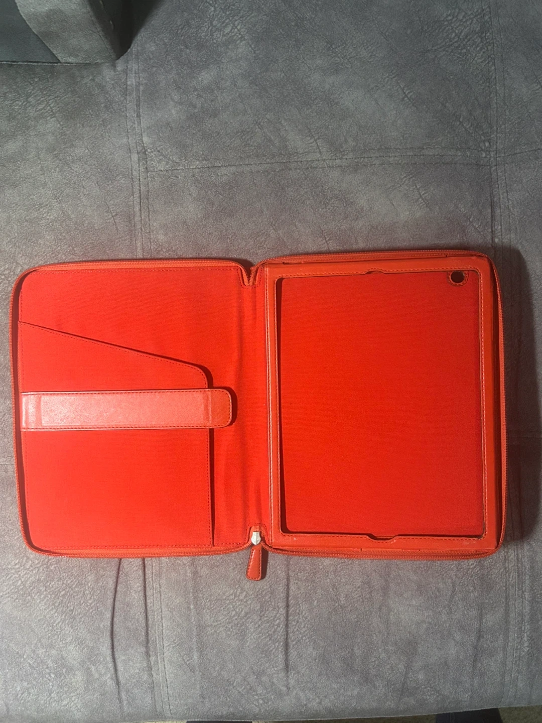 This is a Coach tablet case featuring the signature C pattern in tan and brown with bright orange leather trim. It zips open to reveal a vibrant orange interior with a slot for a tablet and a strap to secure it. It's perfect for protecting your device in style!